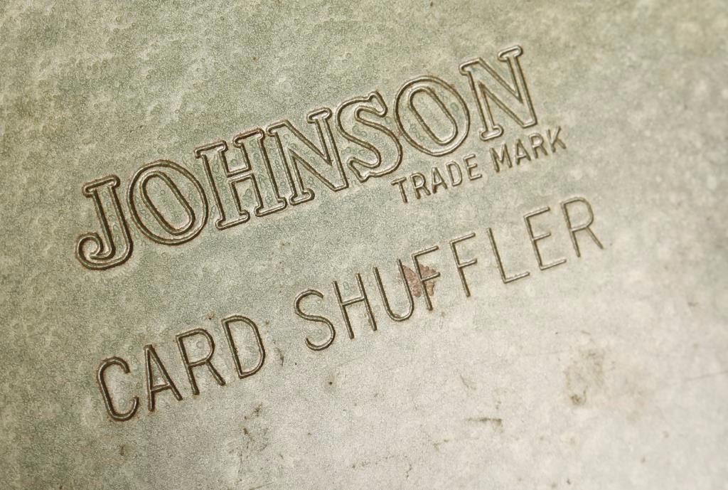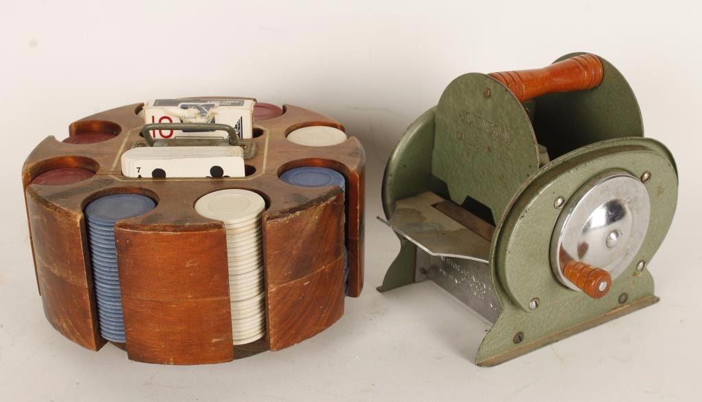 Including: a wooden poker carousel with 2 decks of cards and red, white and blue chips, a Johnson card shuffler