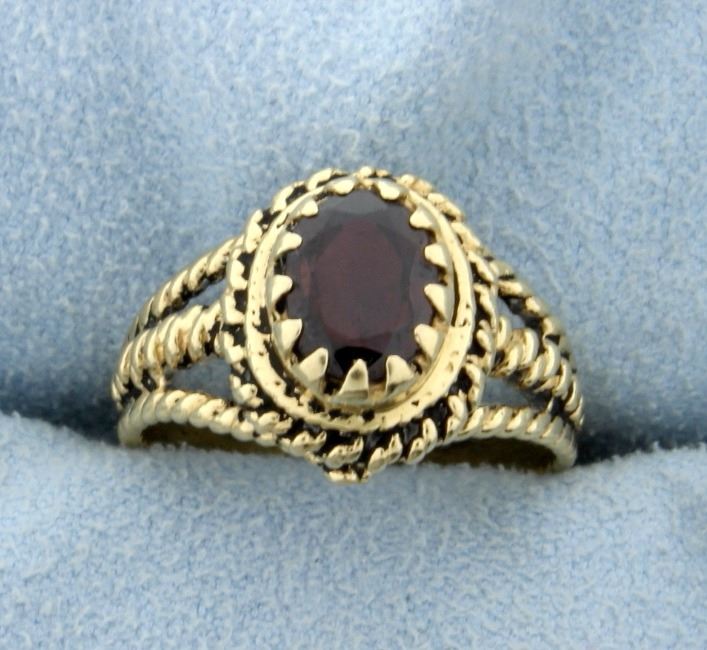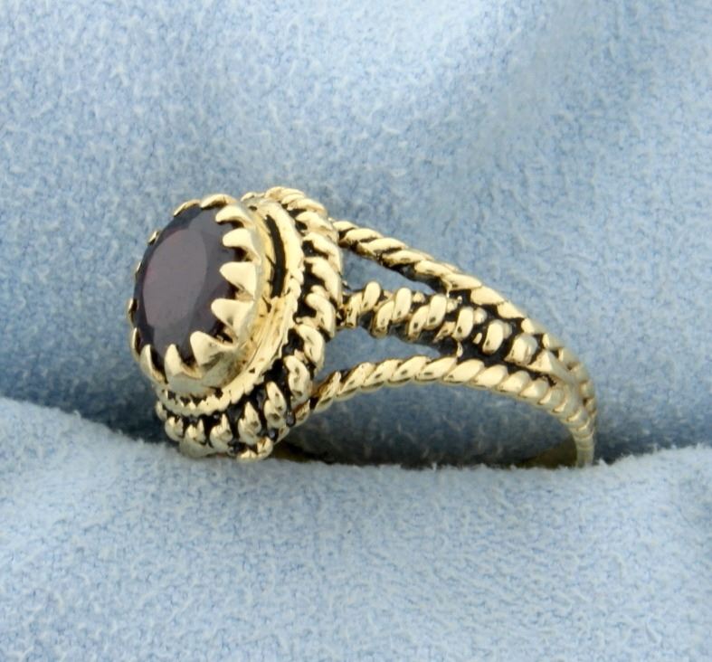 In 14K yellow gold this ring contains a 1.5ct garnet gemstone and is a size 7 1/4. 4.8g