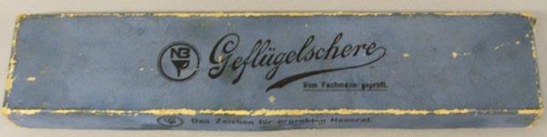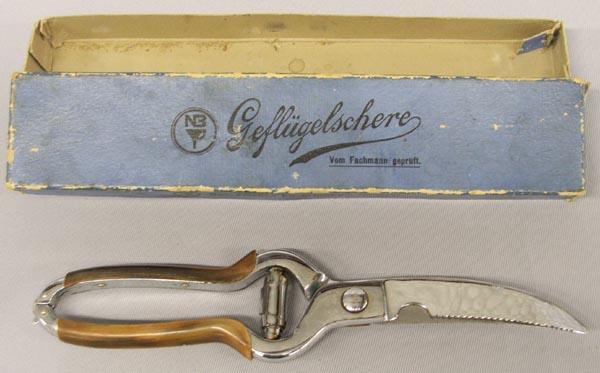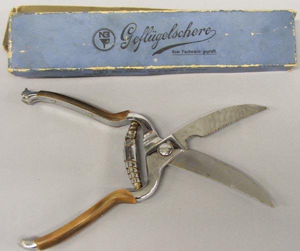 Vintage Geflugelschere Meat Scissors. In original box, measures approx. 10'' long. SHI $20.