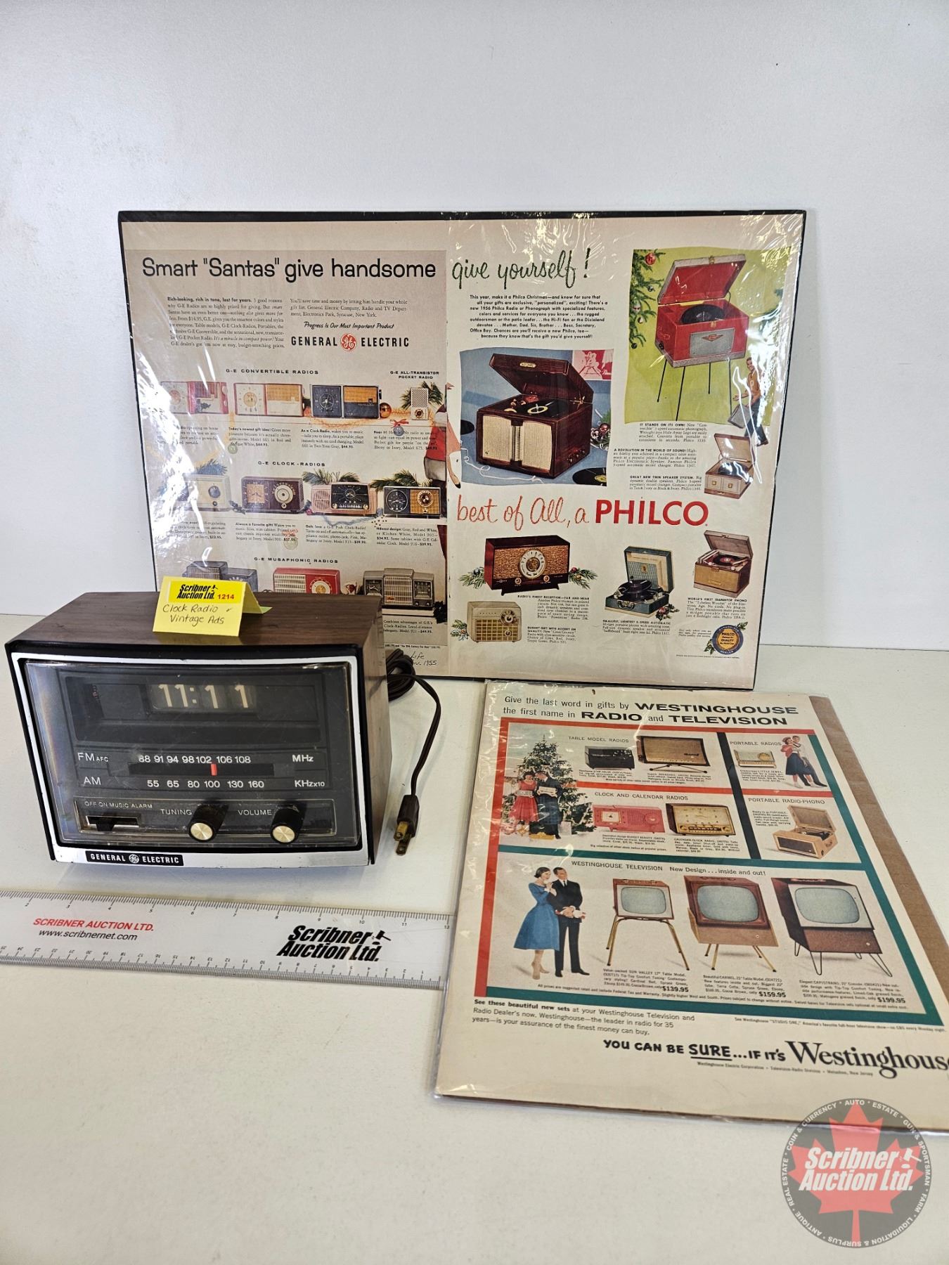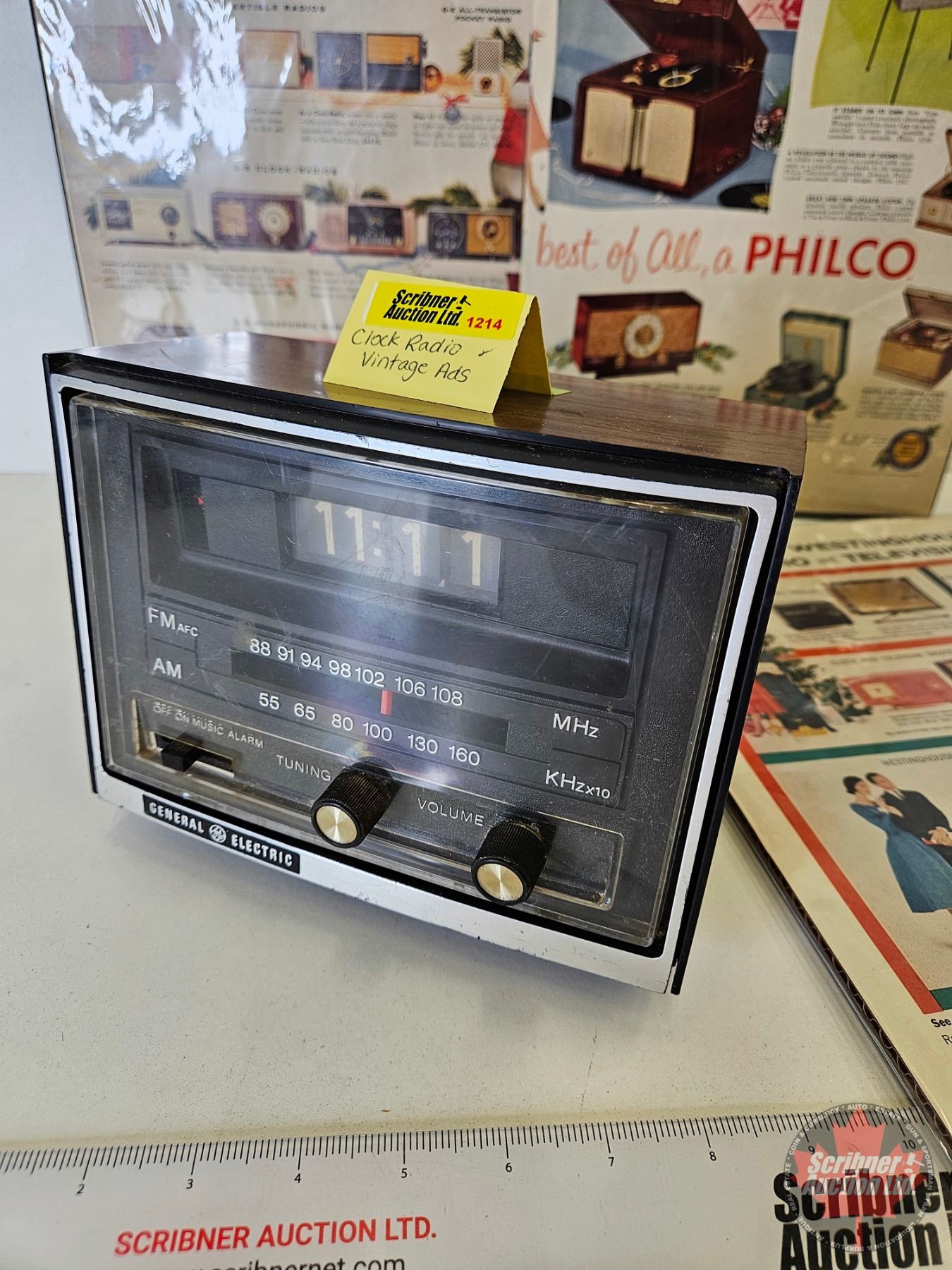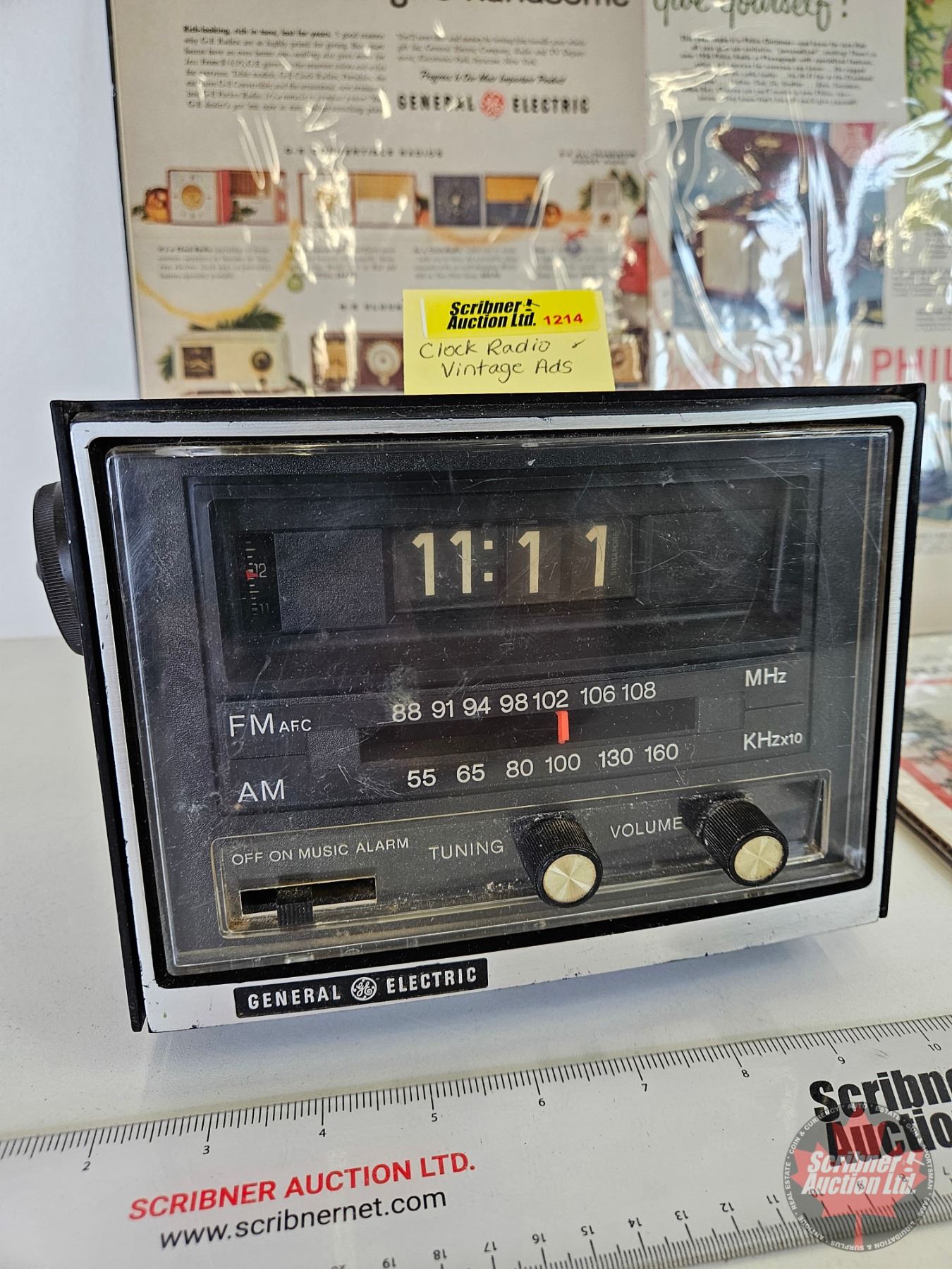 Vintage General Electric Clock Radio w/Radio Magazine Ads (2)