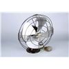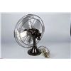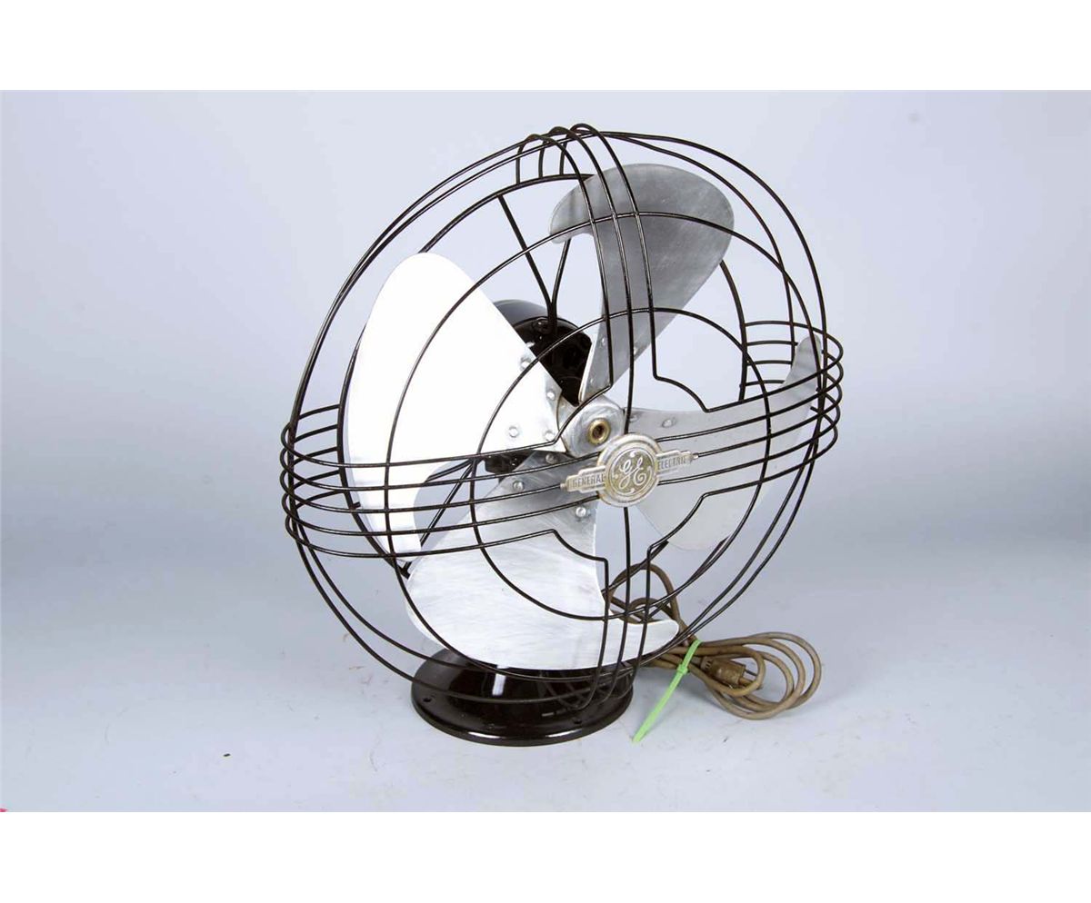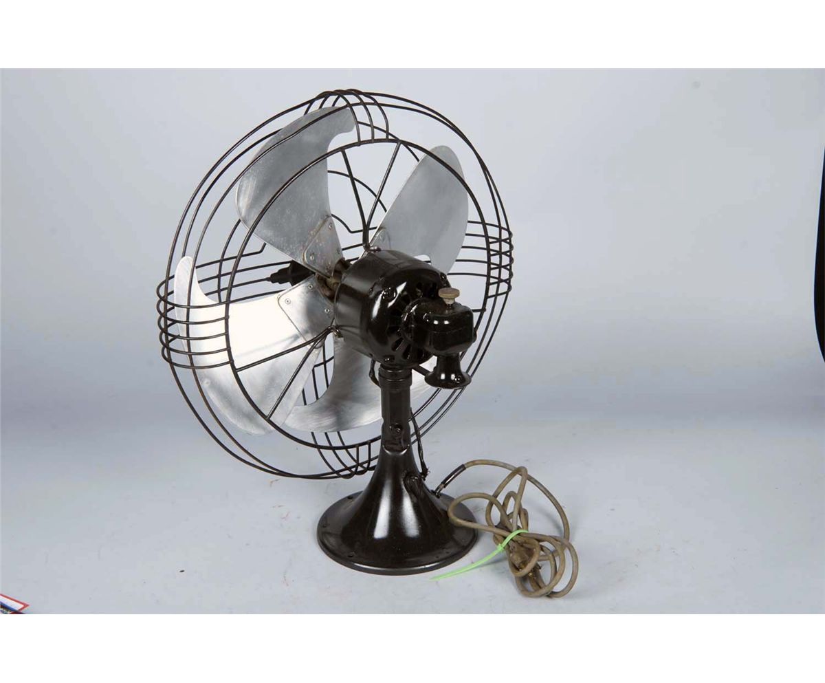 Black with 4 aluminum "trailing tip" fan blades and original front logo on Art Deco style cage. Condition (Restored). Size 20" T.