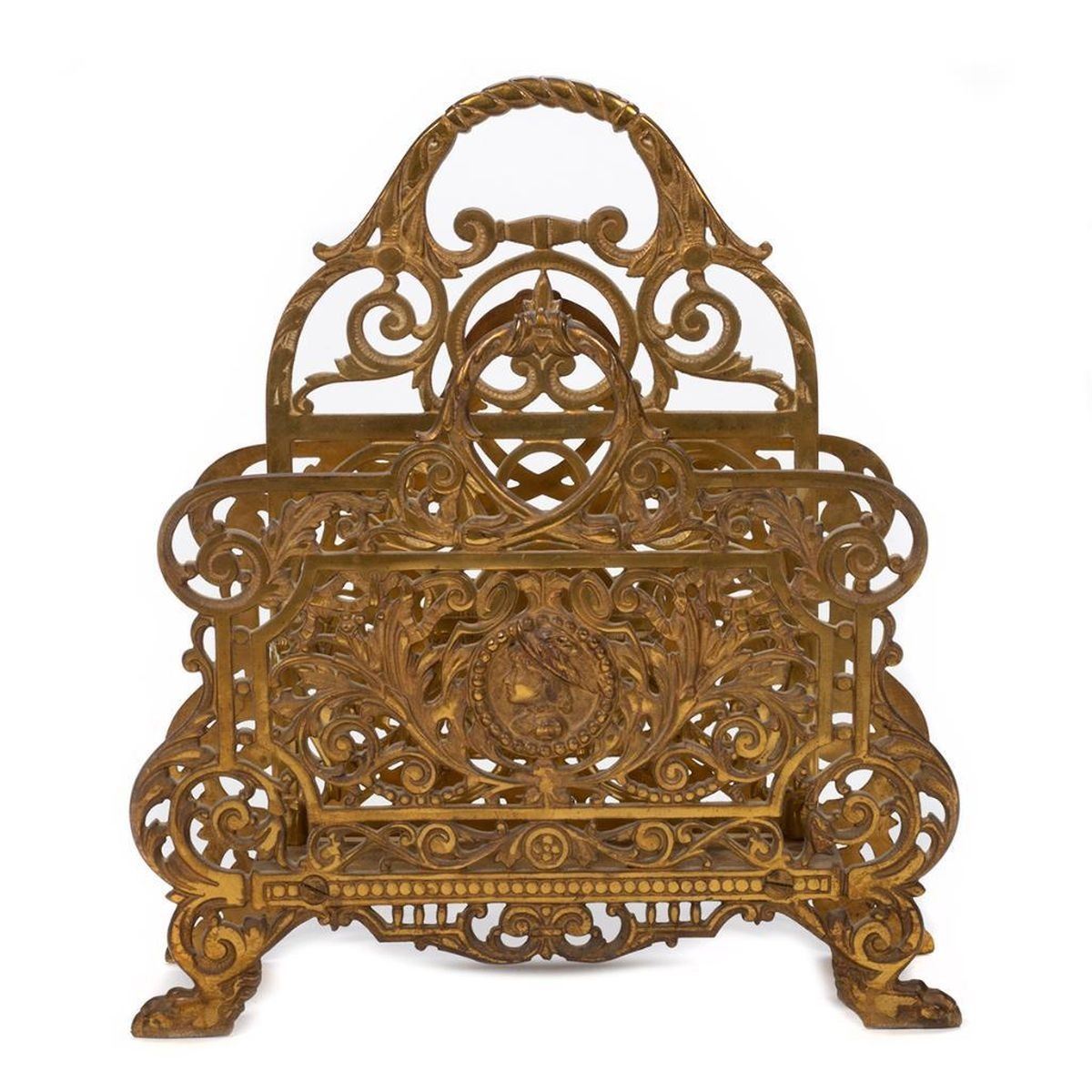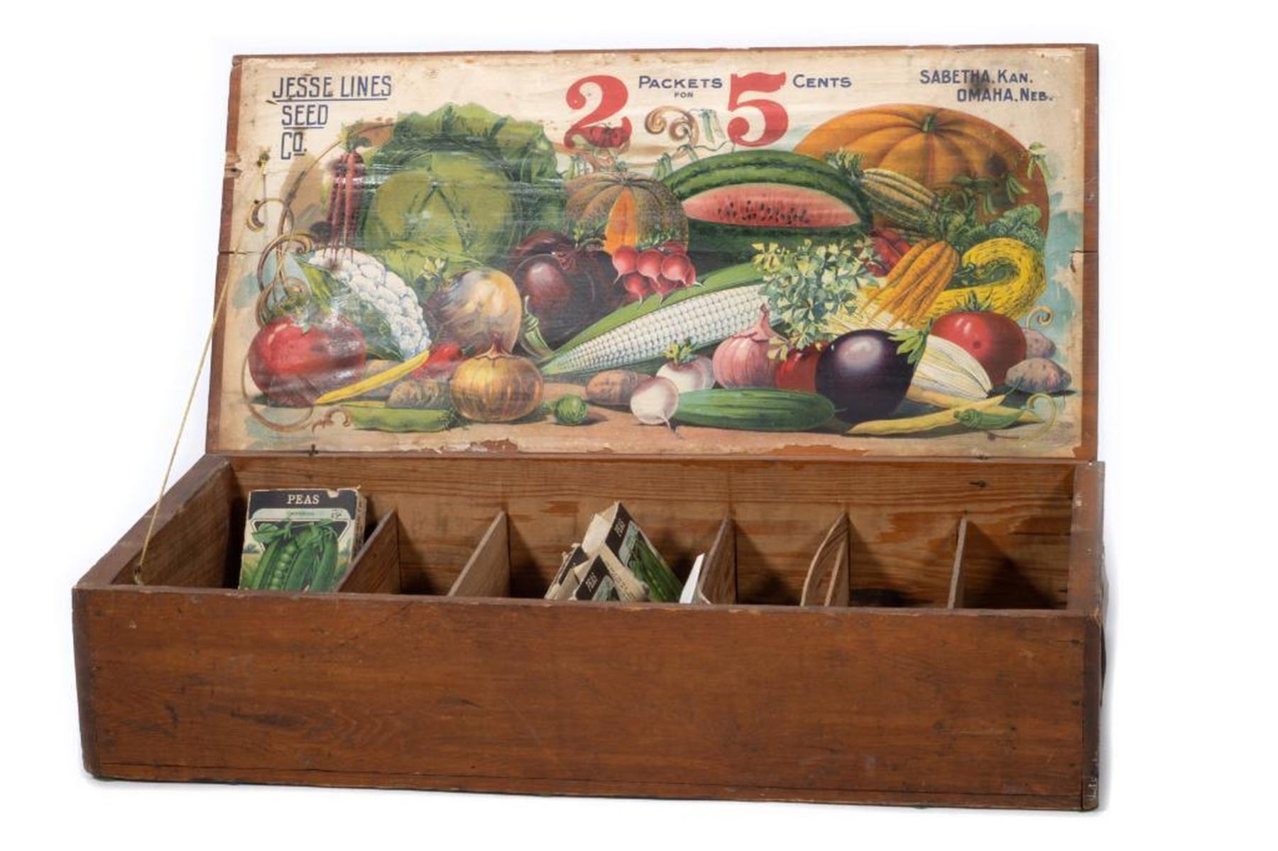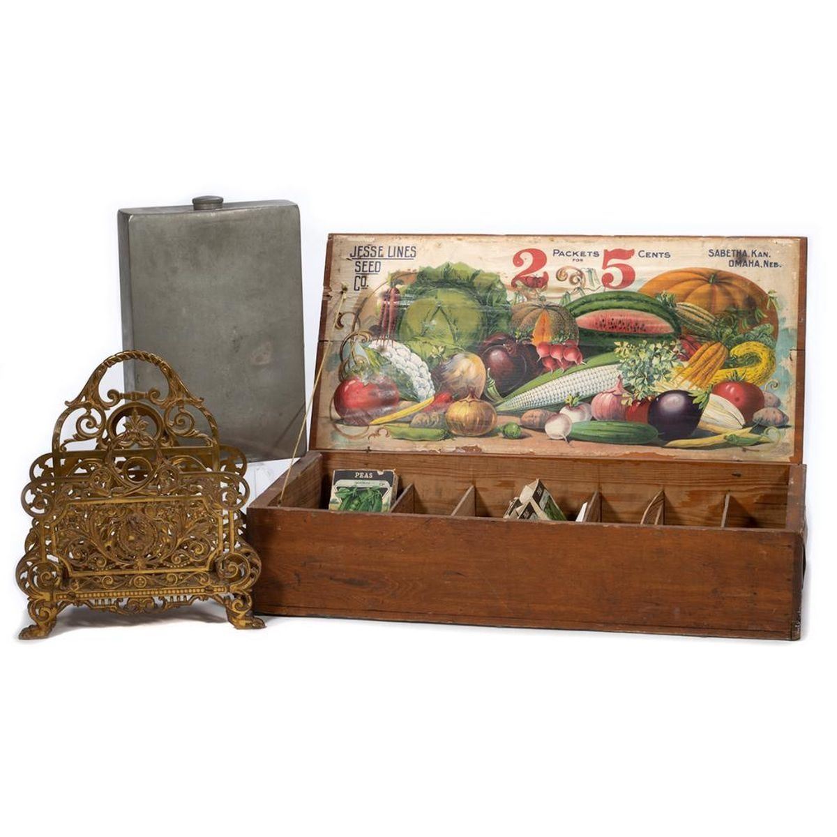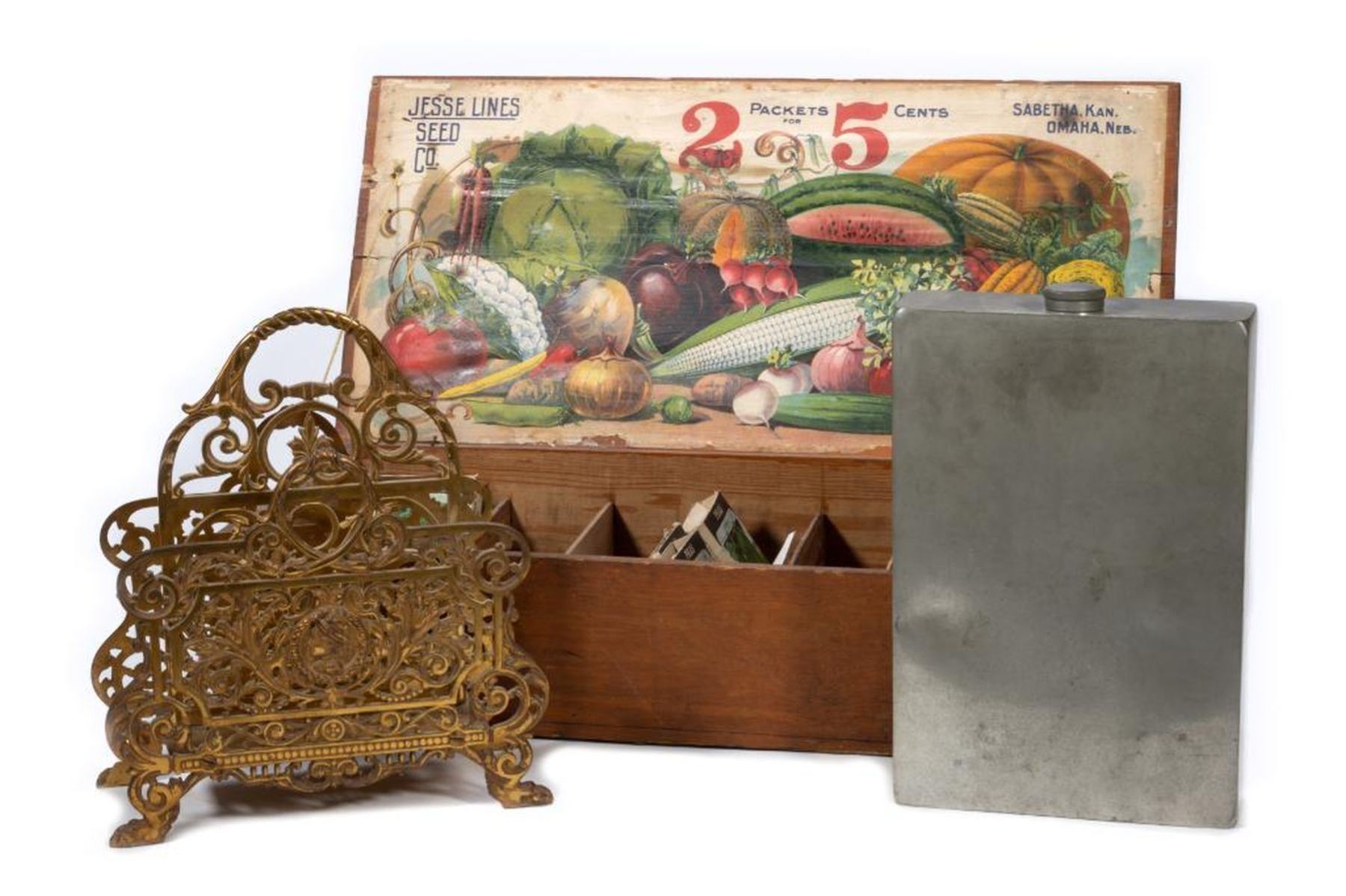 Including a Jesse Lines Seed Co. painted display, A Sheffield Plate water cooler, and gilt metal file holder. Greatest length 24in. (61cm)