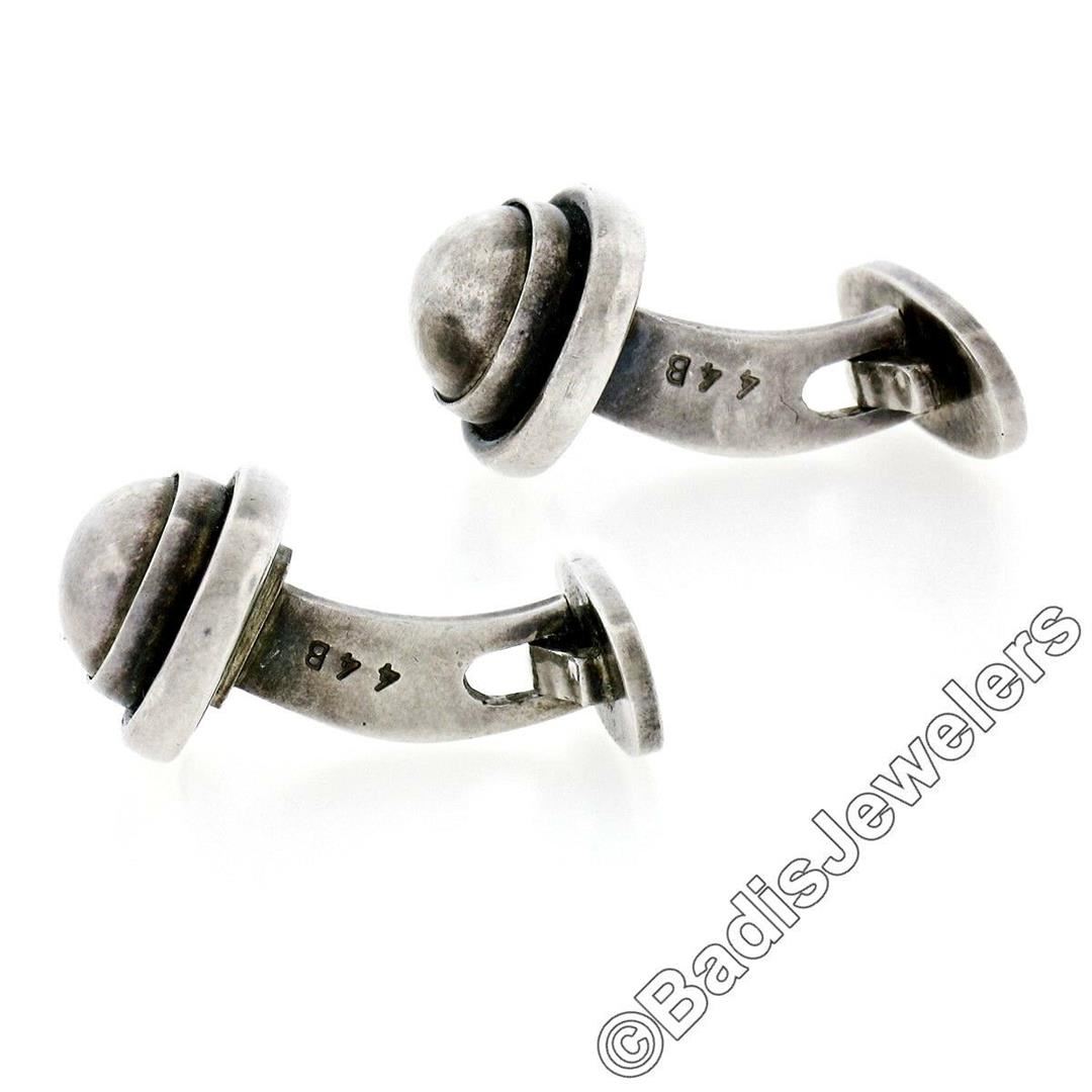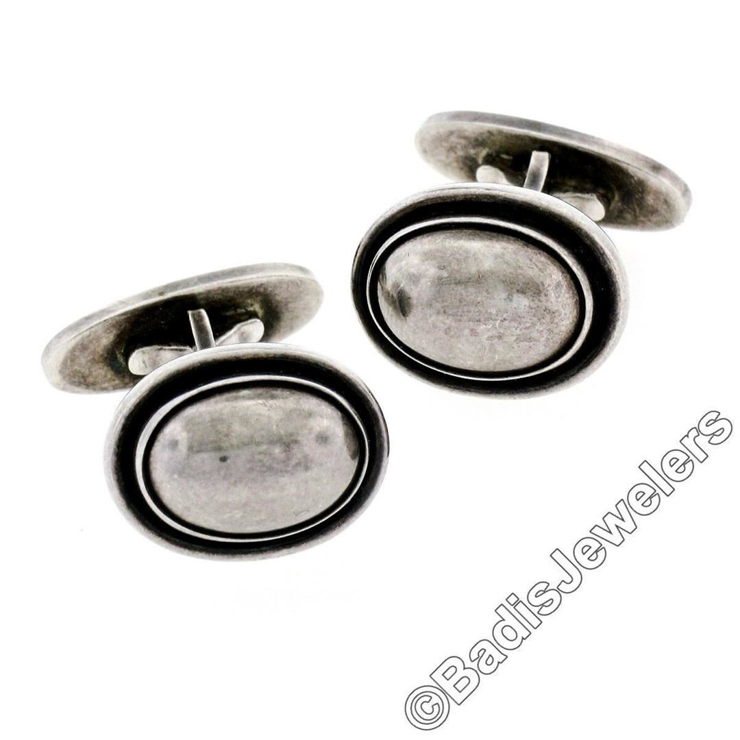 A vintage pair of sterling silver cuff links by Georg Jensen featuring a plain puffed oval design with a pattern number of 44B. These cuff links have a swivel back design with a clearence of 13.0mm, weigh a total of 13.51 grams, and the front panels measure 16.75x12.75mm.