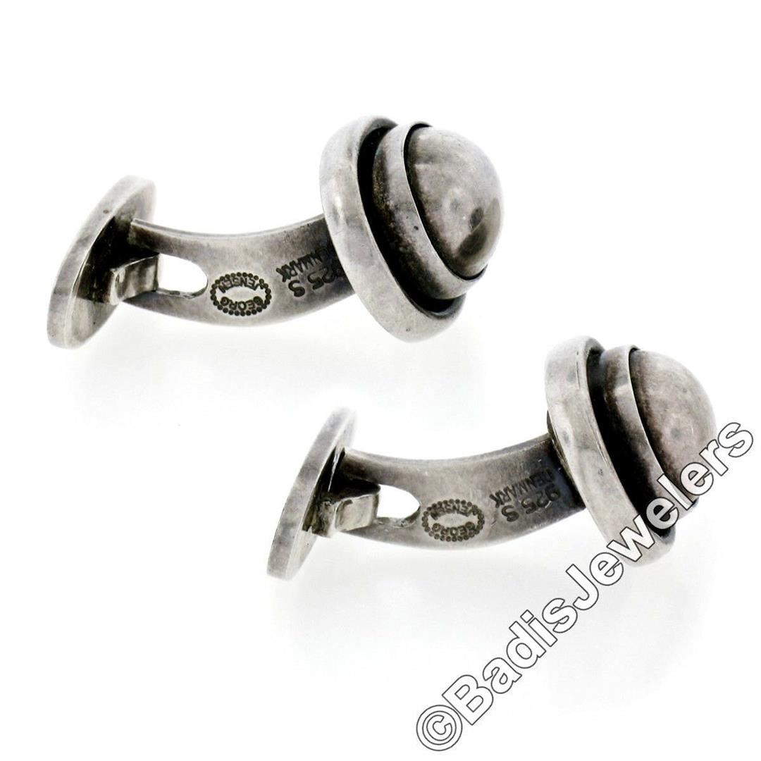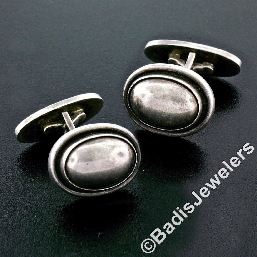 A vintage pair of sterling silver cuff links by Georg Jensen featuring a plain puffed oval design with a pattern number of 44B. These cuff links have a swivel back design with a clearence of 13.0mm, weigh a total of 13.51 grams, and the front panels measure 16.75x12.75mm.