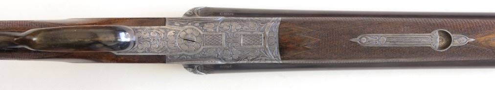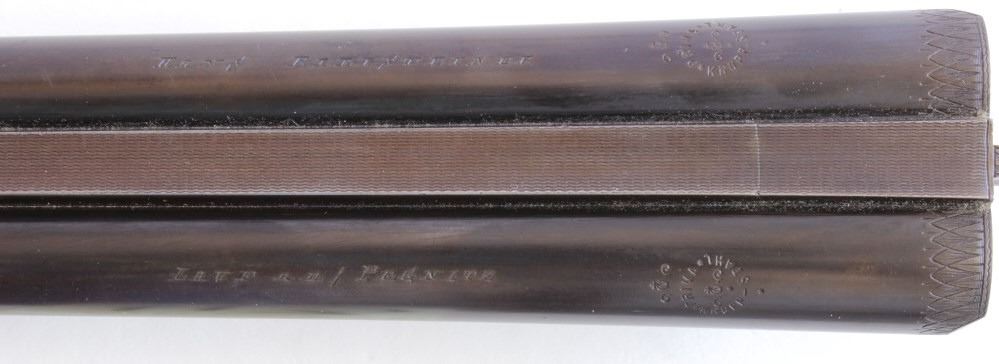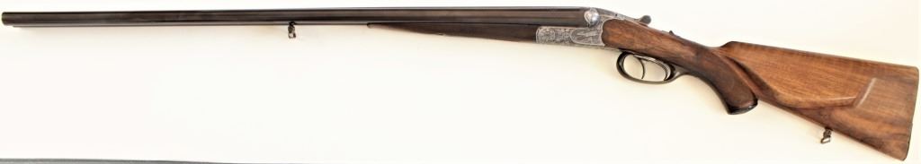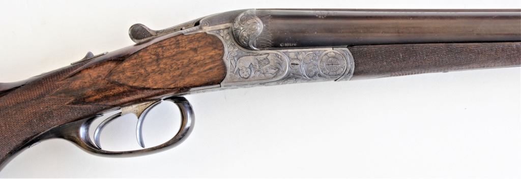 Vintage German 16 ga. SN 13280 hammerless boxlock shotgun project, nicely engraved. Top of the barrel is chisel engraved Hans Bleisteiner Lauf AD Pegnitz probably the original owner which the gun was made for in Pegnitz Bavania Germany otherwise unmarkedboxlock shotgun project, nicely engraved. Top of the barrel is chisel engraved Hans Bleisteiner Lauf AD Pegnitz probably the original owner which the gun was made for in Pegnitz Bavania Germany otherwise unmarked. The barrel is further stampedNitro and Prima Krupp Stahl on both sides, the flats with various proofs including bore designation, choke bore barrels, pre 1939 definitive proof and cylinder bore shot. In front of flats is matching serial number,Flussstahl-Krupp-Essen and eagle crown S smoothbore proof. Features of the shotgun include matte rib, cocking indicators, double triggers, sling swivels and walnut stocks. Pistol grip buttstock is finely checkered at the wrist withincorporated cheek piece capped in horn to match trigger guard unfinished shortening with no buttplate. Receiver is 95% engraved coverage in floral tendrils with bordered deer and hunt dog panel scenes on each side, light engraving onbreech end of 29 3/4" long barrels, matching engraving on forend hardware. Action functions nicely with fair bores. From an old St. Louis collection. Est. 1250-42000
