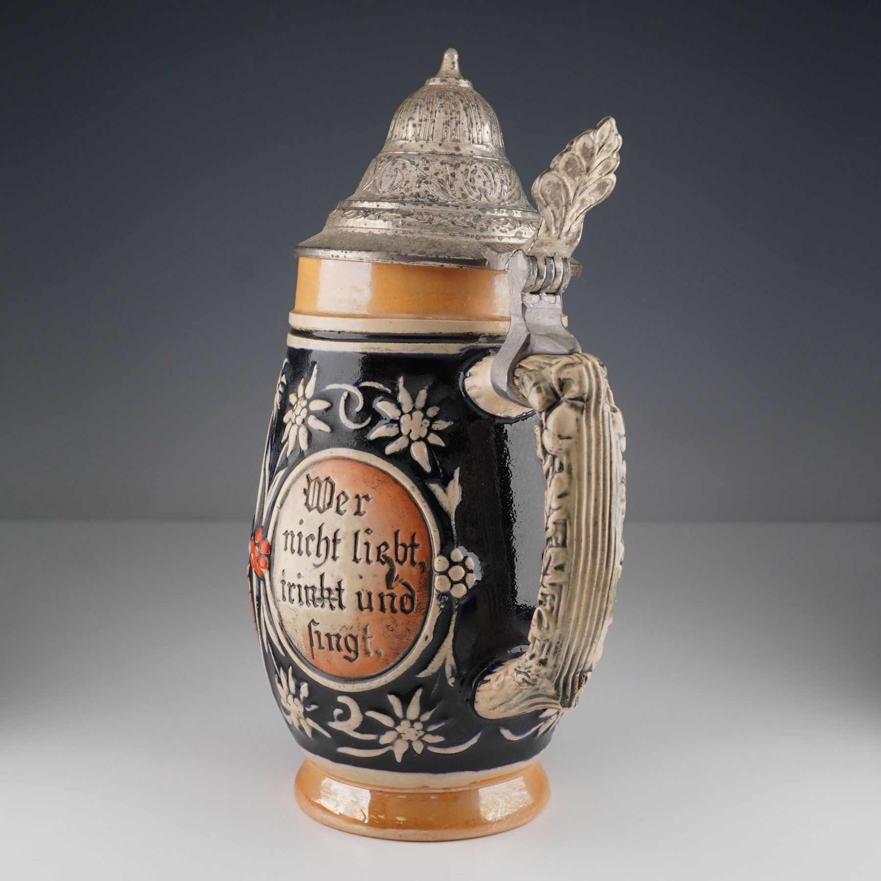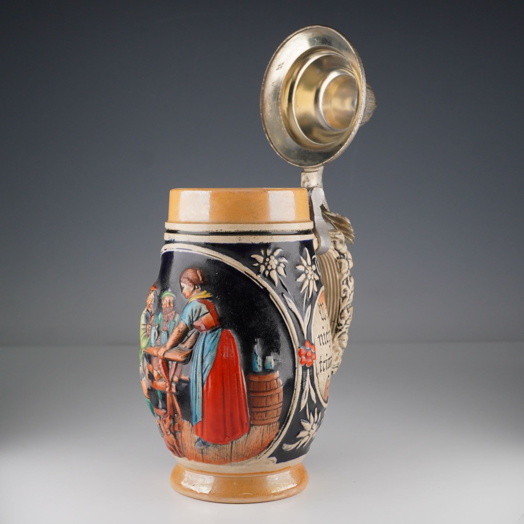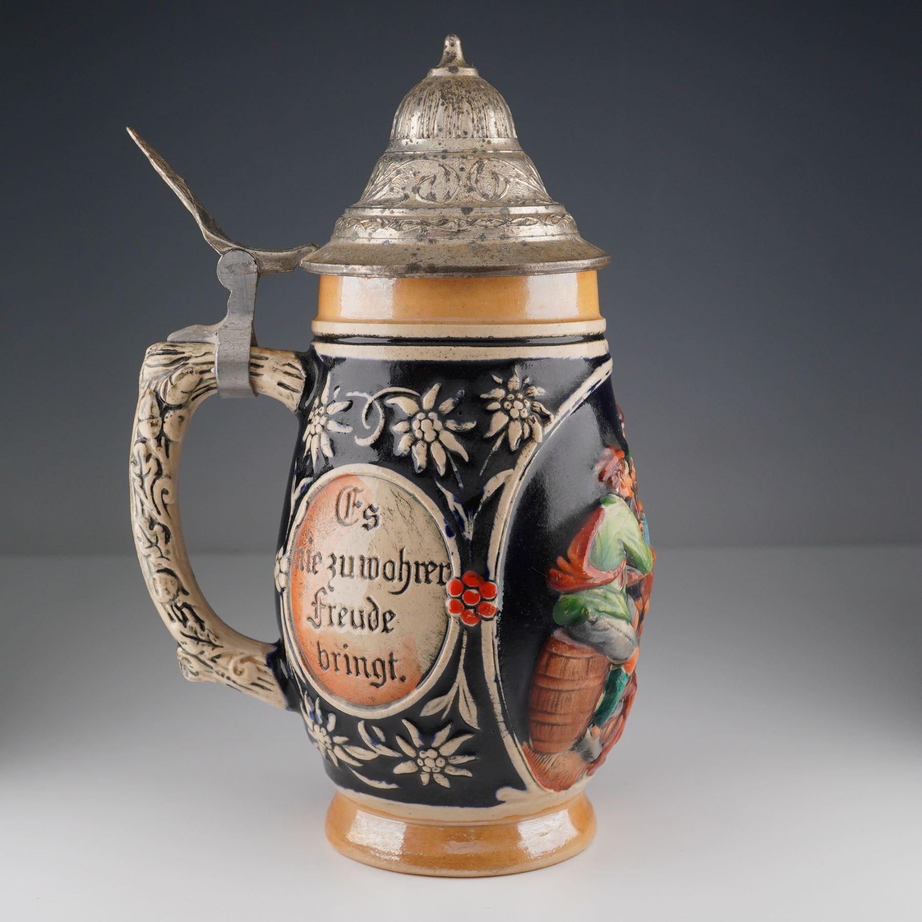 Featuring a detailed relief scene of tavern patrons sharing drinks, surrounded by raised floral motifs and traditional German inscriptions reading "Es eine zuwohre freude bringt" and "Wer nicht liebt, trinkt und singt." The stein has a pewter lid with ornate repousse decoration and a thumb lift shaped like a leaf. Marked on the underside "Made in Germany". Model No. 3.