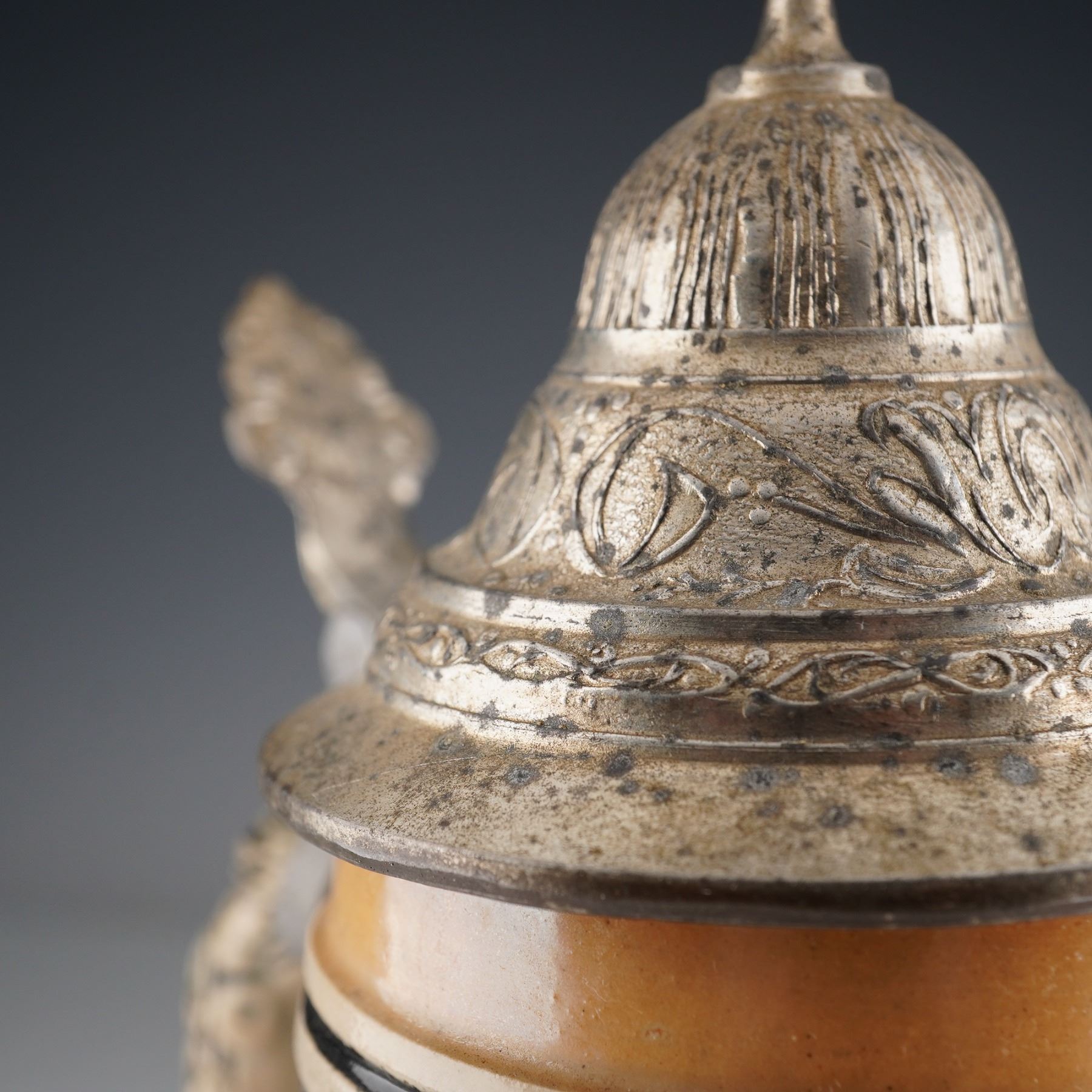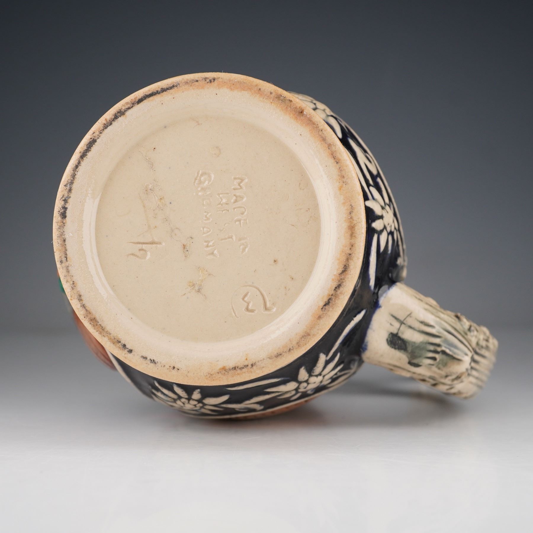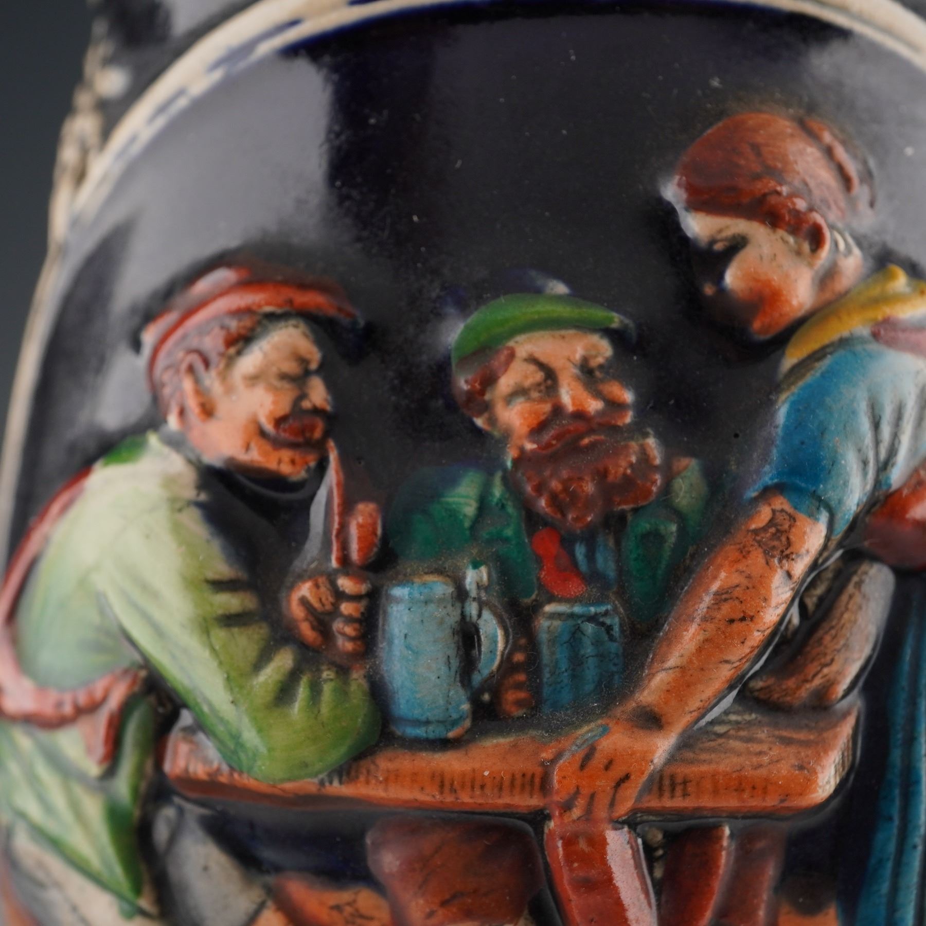 Featuring a detailed relief scene of tavern patrons sharing drinks, surrounded by raised floral motifs and traditional German inscriptions reading "Es eine zuwohre freude bringt" and "Wer nicht liebt, trinkt und singt." The stein has a pewter lid with ornate repousse decoration and a thumb lift shaped like a leaf. Marked on the underside "Made in Germany". Model No. 3.
