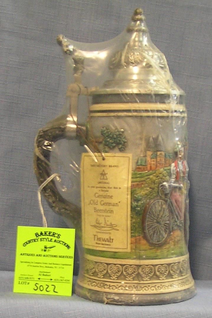 Vintage German Beer stein with great bicycle theme pewter lid and original factory tag this stein is in mint condition $250.00-$300.00