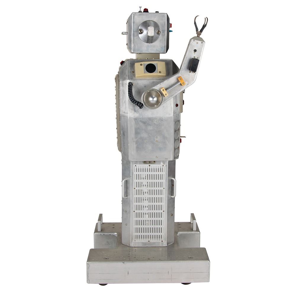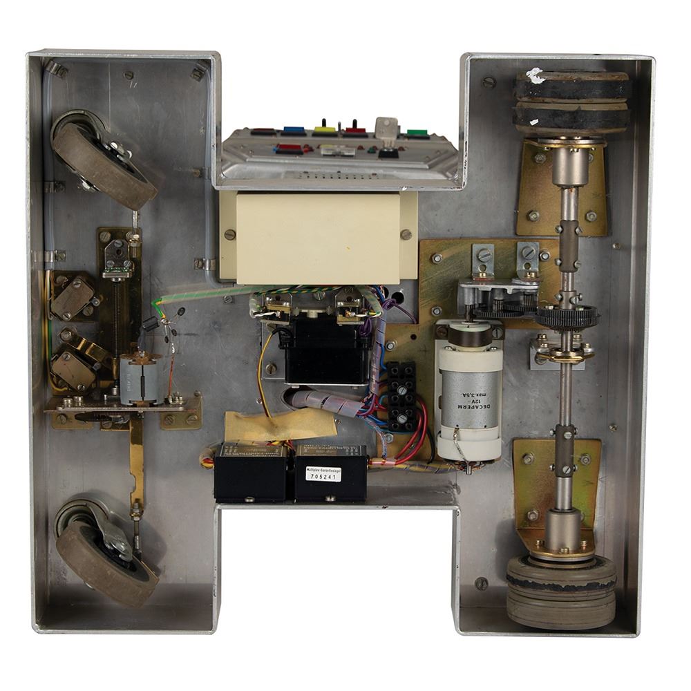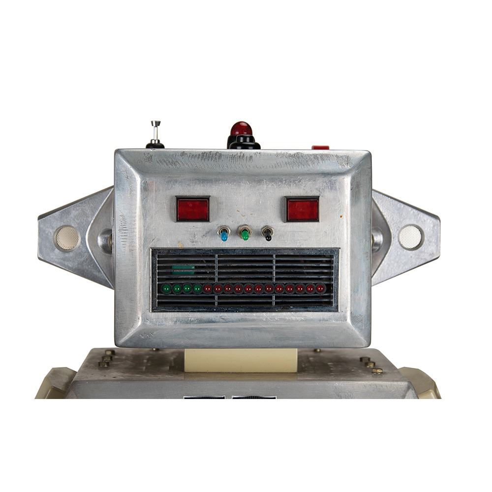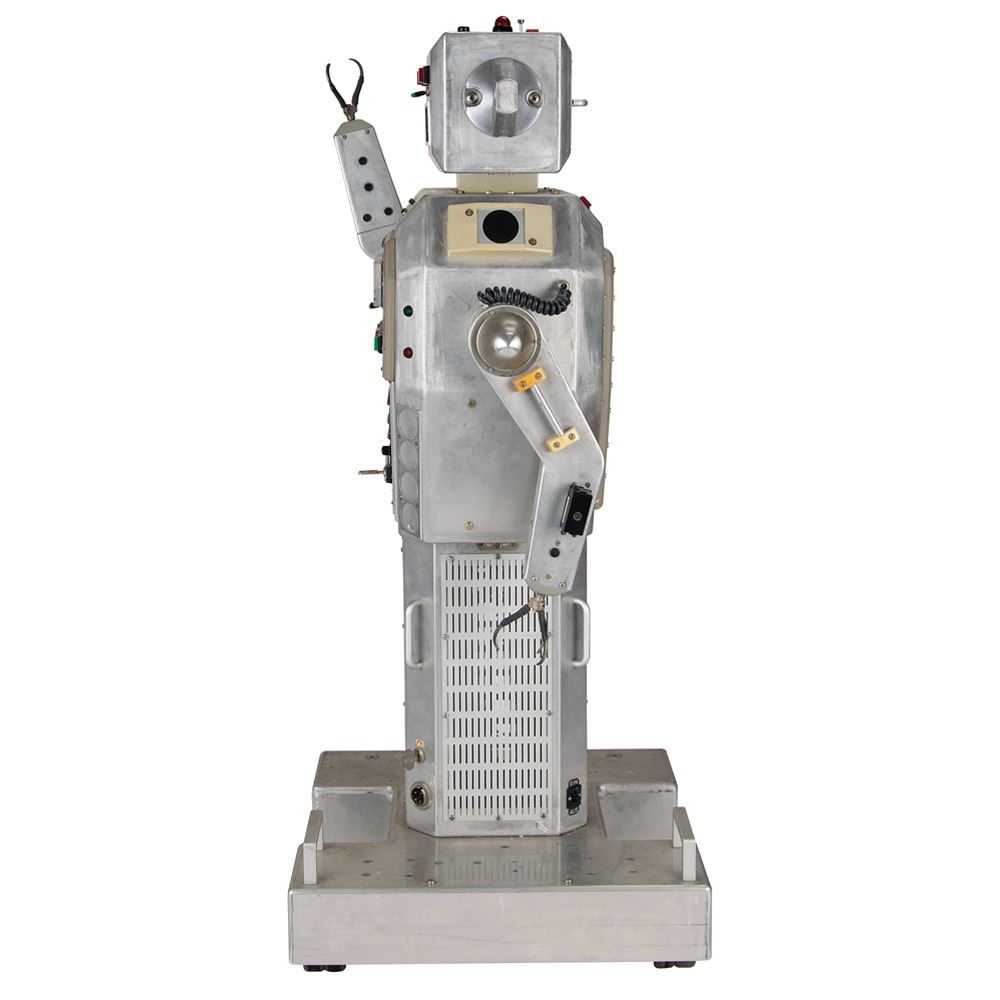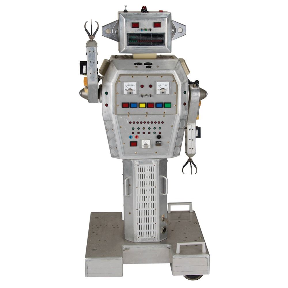 Attractive vintage German-built robot, standing 36Àù tall on a 15.75Àù x 16.75Àù base, featuring: a rectangular head with lighted eyes and mouth; two claw-type hands on moveable arms; chest panel with meters, switches, and lights; rotating torso; and wheels on the bottom. The robot has a four-pin power port at the base; cord not included. In very good to fine cosmetic condition, with the robot's function untested. A highly appealing, distinctive example of a custom, hand-made robot from Germany.