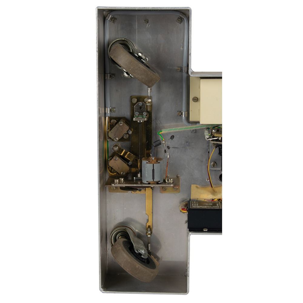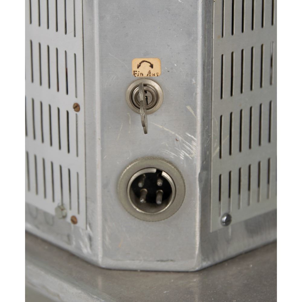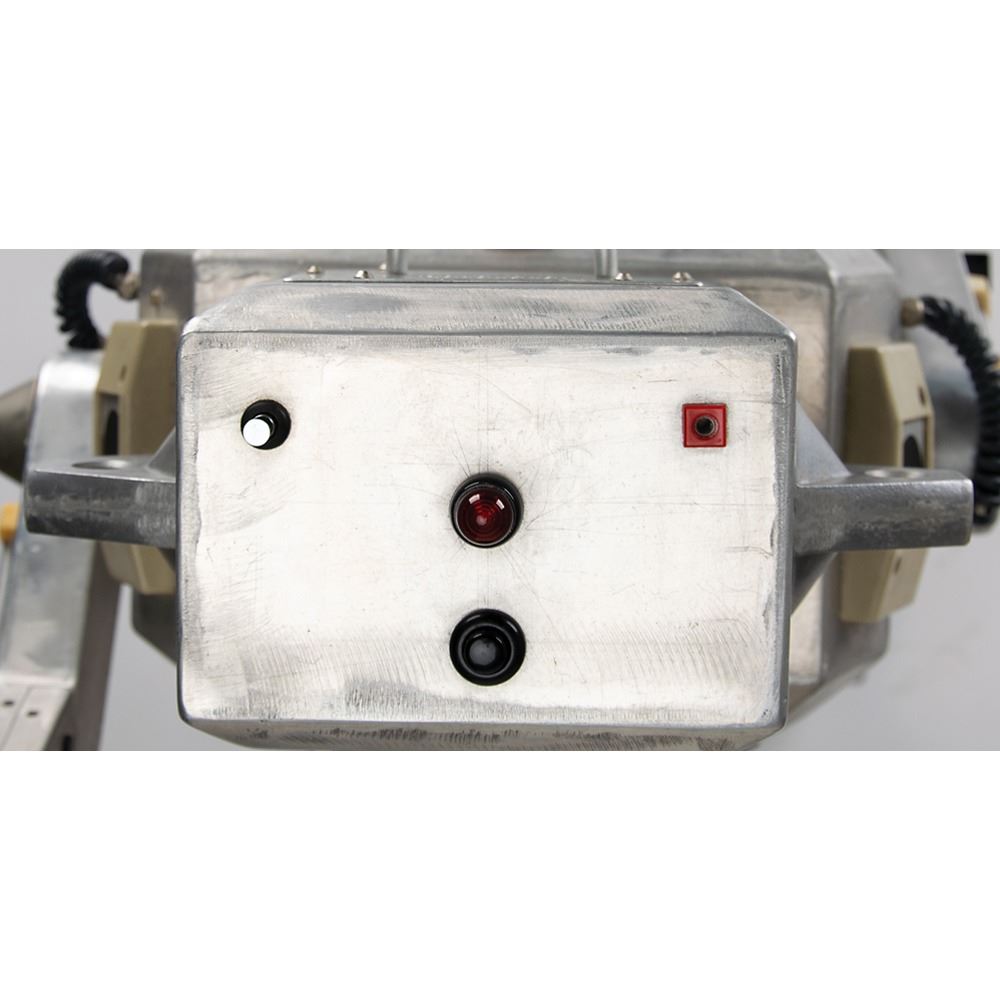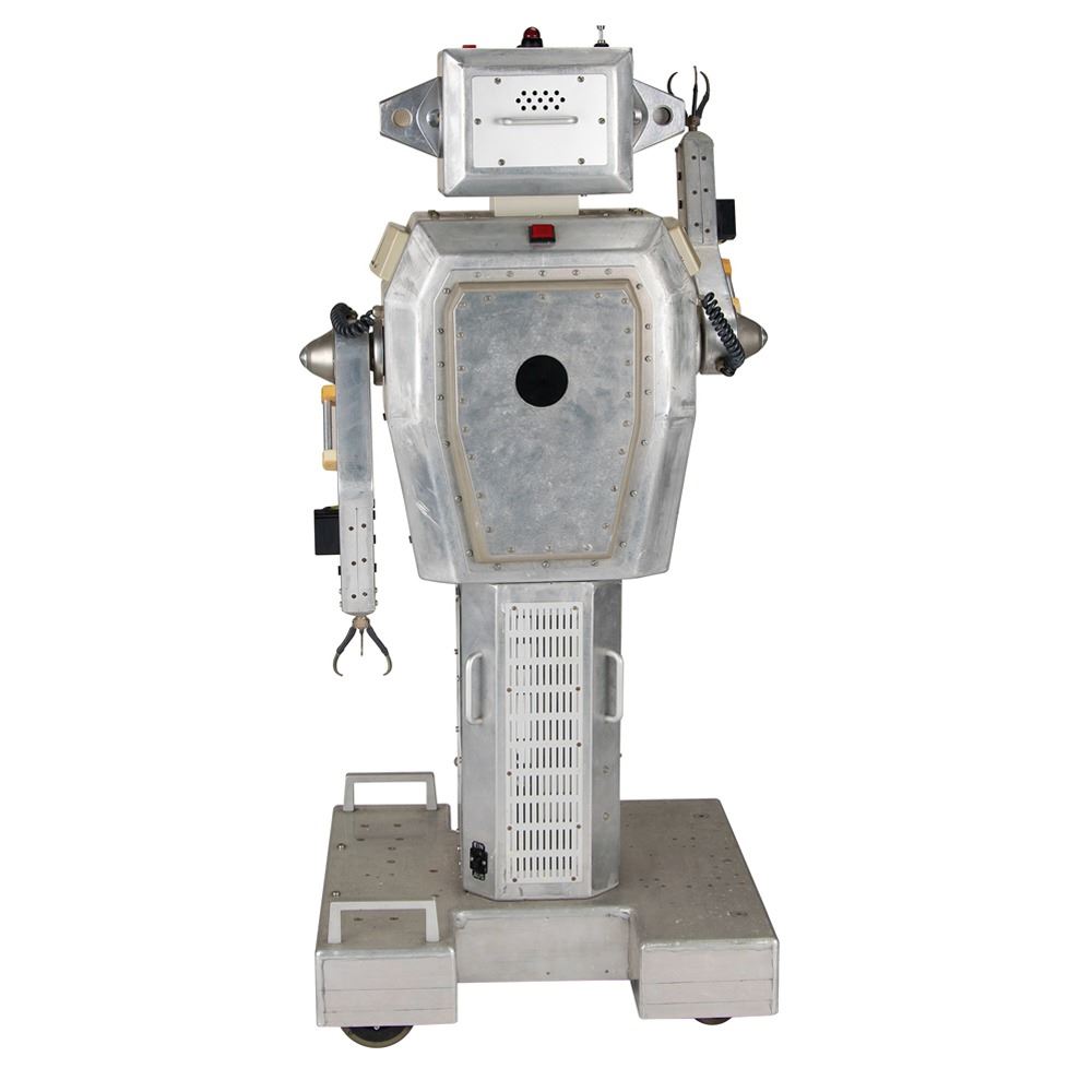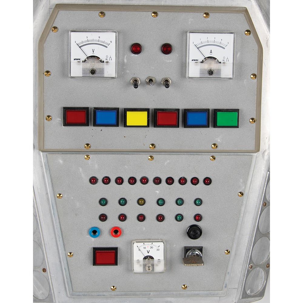 Attractive vintage German-built robot, standing 36Àù tall on a 15.75Àù x 16.75Àù base, featuring: a rectangular head with lighted eyes and mouth; two claw-type hands on moveable arms; chest panel with meters, switches, and lights; rotating torso; and wheels on the bottom. The robot has a four-pin power port at the base; cord not included. In very good to fine cosmetic condition, with the robot's function untested. A highly appealing, distinctive example of a custom, hand-made robot from Germany.