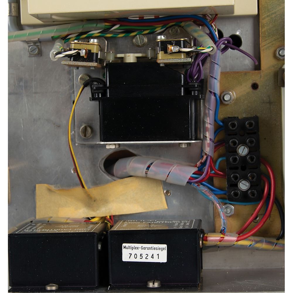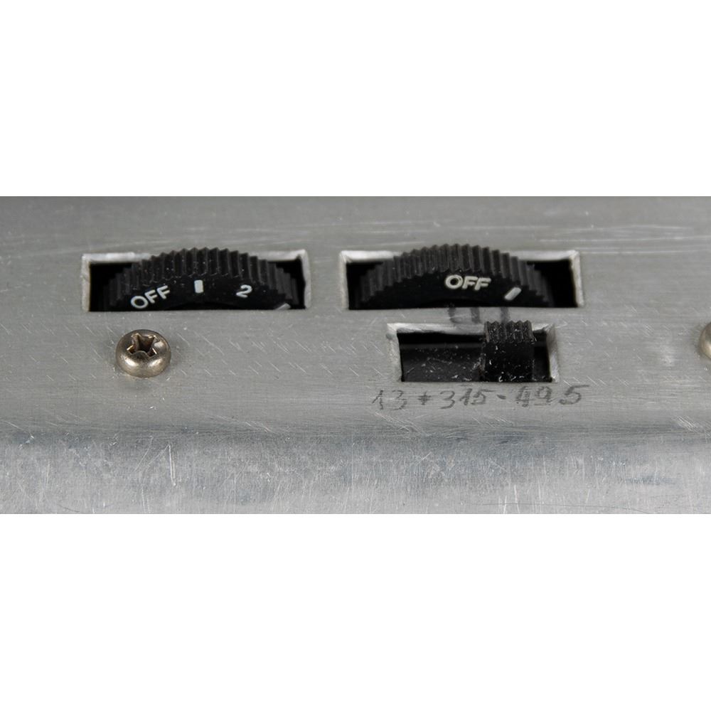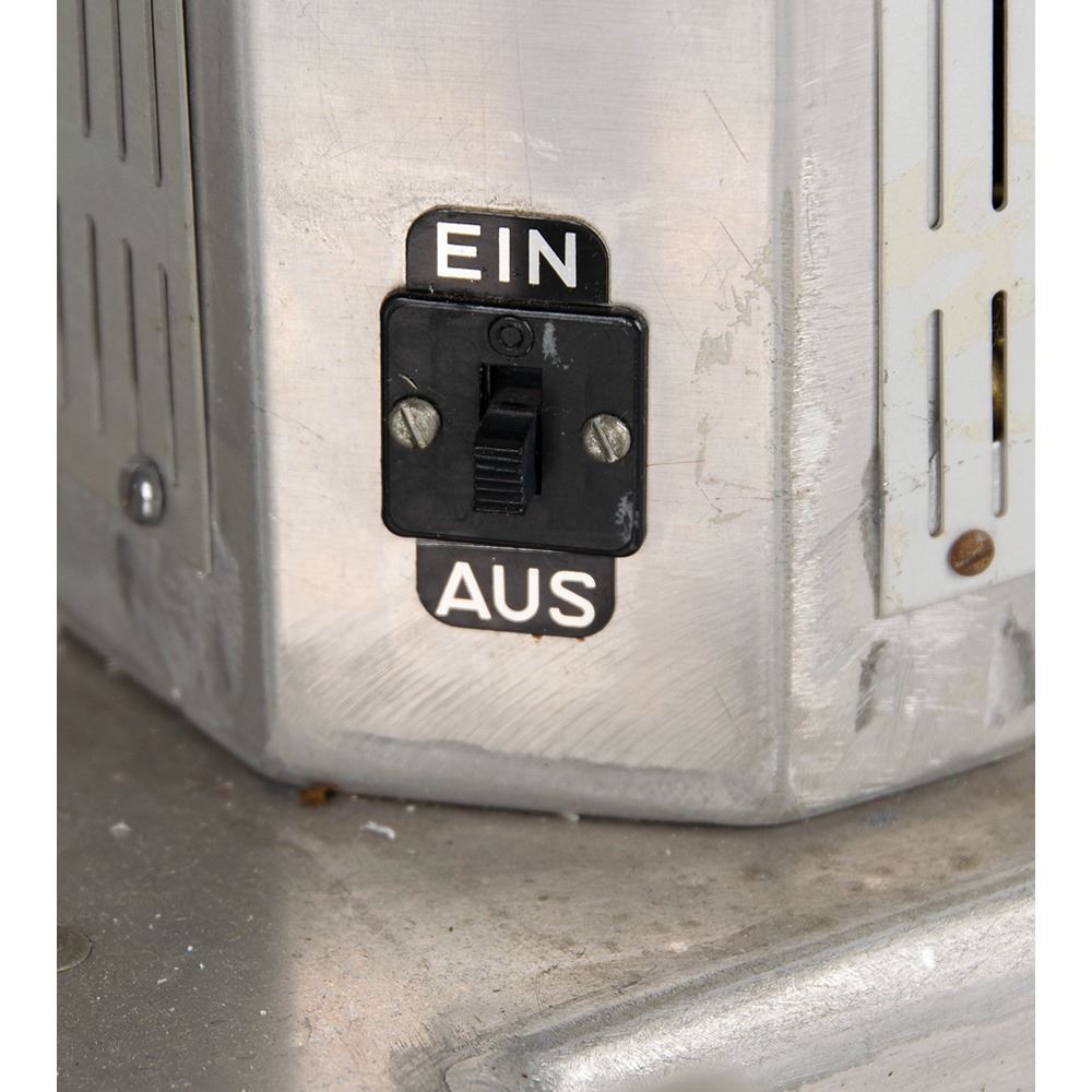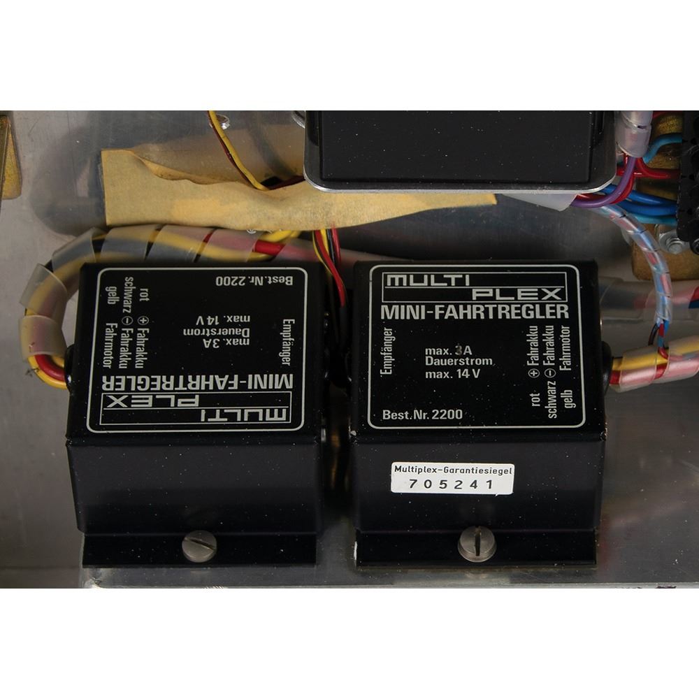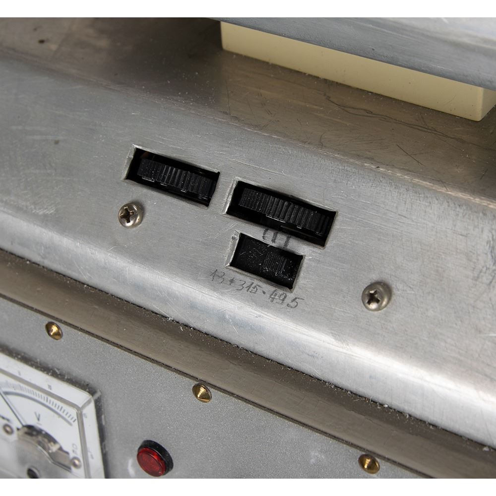 Attractive vintage German-built robot, standing 36Àù tall on a 15.75Àù x 16.75Àù base, featuring: a rectangular head with lighted eyes and mouth; two claw-type hands on moveable arms; chest panel with meters, switches, and lights; rotating torso; and wheels on the bottom. The robot has a four-pin power port at the base; cord not included. In very good to fine cosmetic condition, with the robot's function untested. A highly appealing, distinctive example of a custom, hand-made robot from Germany.