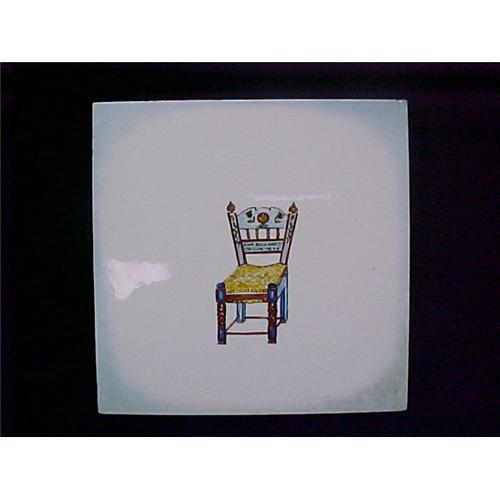 A colorful and detailed hand painted ceramic tile 6 inches square of a child?s chair. The tile has an off white glaze grading to pale blue at the margins. The chair is made of turned wood and has a wicker seat. It is very gaily painted in blue, brown and pale blue and is decorated with flowers and vines. The back of the chair carries the inscription ?Ana Elizabeth Seilin 1834?. This may be a painting of a family heirloom. The chair is about 2 ½ inches tall. The painting is attributed to Germany and is at least 50 years old. There are several markings on the back of the tile, most notably a ?G? within a wreath. We believe the markings refer to the tile alone and do not relate to the origin of the painting. There is no wear or damage but the glaze does show some fine crazing.