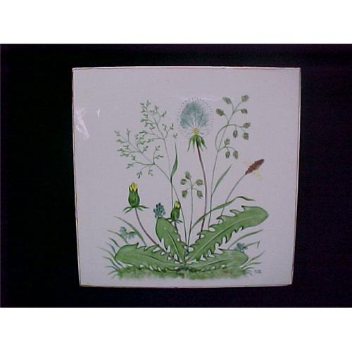 A beautiful and delicate hand painted ceramic tile 6 inches square of a dandelion ?puff? and other green wildflowers and small plants. The painting is signed ?J.W.? in the lower right corner. The painting is attributed to Germany and is at least 50 years old. The glaze is an off white and there is some fine crazing. There are several markings on the back of the tile, most notably a ?G? within a wreath. We believe the markings refer to the tile alone and do not relate to the origin of the painting.