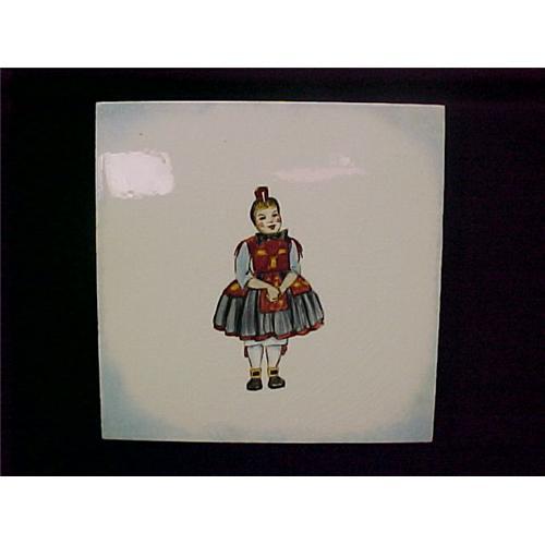 A striking hand painted ceramic tile 6 inches square of a woman in regional costume. The tile has an off white glaze grading to pale blue at the margins. The detailed painting is of a woman wearing a regional costume consisting of buckle shoes, white stockings, black leggings, a dark gray ?artists? smock and a pill-box hat in ochre and green. The figure is about 4 ½ inches tall. The painting is attributed to Germany and is at least 50 years old. There are several markings on the back of the tile, most notably a ?G? within a wreath. We believe the markings refer to the tile alone and do not relate to the origin of the painting. There is no wear or damage but the glaze does show some fine crazing