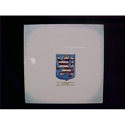 <table width="100%" border="0" cellspacing="0" cellpadding="4"><tr><td><em> </em></td></tr><tr> <td width="100%"> An interesting and detailed hand painted ceramic tile 6 inches square of a heraldic crest. The tile has an off white glaze grading to pale blue at the margins. The crest is an ochre and white striped gold crowned lion rampant on a field of blue. Below it are the inscriptions ?ALTE UND NEUE HESSICHE TRACHTEN? and ?ERDMUTHE LUITJENS, HAMBURG?. The crest is 2 inches tall by 1 3/8 inches wide. The painting is attributed to Germany and is at least 50 years old. There are several markings on the back of the tile, most notably a ?G? within a wreath. We believe the markings refer to the tile alone and do not relate to the origin of the painting. There is no wear or damage but the glaze does show some fine crazing.