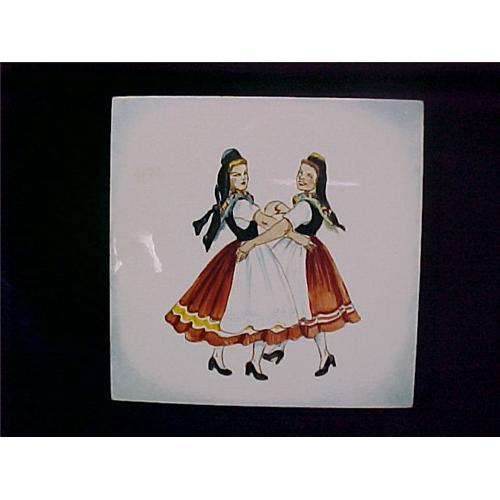 A detailed hand painted ceramic tile 6 inches square of two young folk-dancing women in regional costumes. The tile has an off white glaze grading to pale blue at the margins. The two women are dressed alike in mid-calf full ochre skirts with long aprons. They wear short sleeved white blouses and black vests with multicolored scarves. The figures are about 4 ½ inches tall. The painting is attributed to Germany and is at least 50 years old. There are several markings on the back of the tile, most notably a ?G? within a wreath. We believe the markings refer to the tile alone and do not relate to the origin of the painting. There is no wear or damage but the glaze does show some fine crazing.