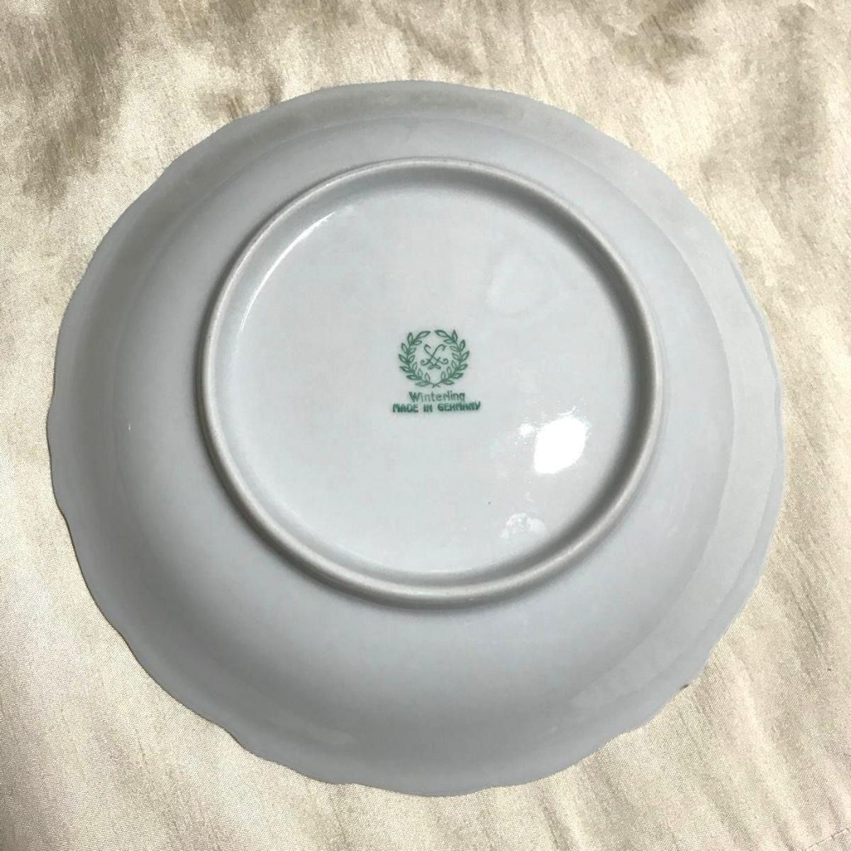 Vintage German Winterling porcelain scalloped serving bowl with pink roses pattern & gilt edging. Stamped on reverse side. 7 1/2" D X 1 1/2" H.