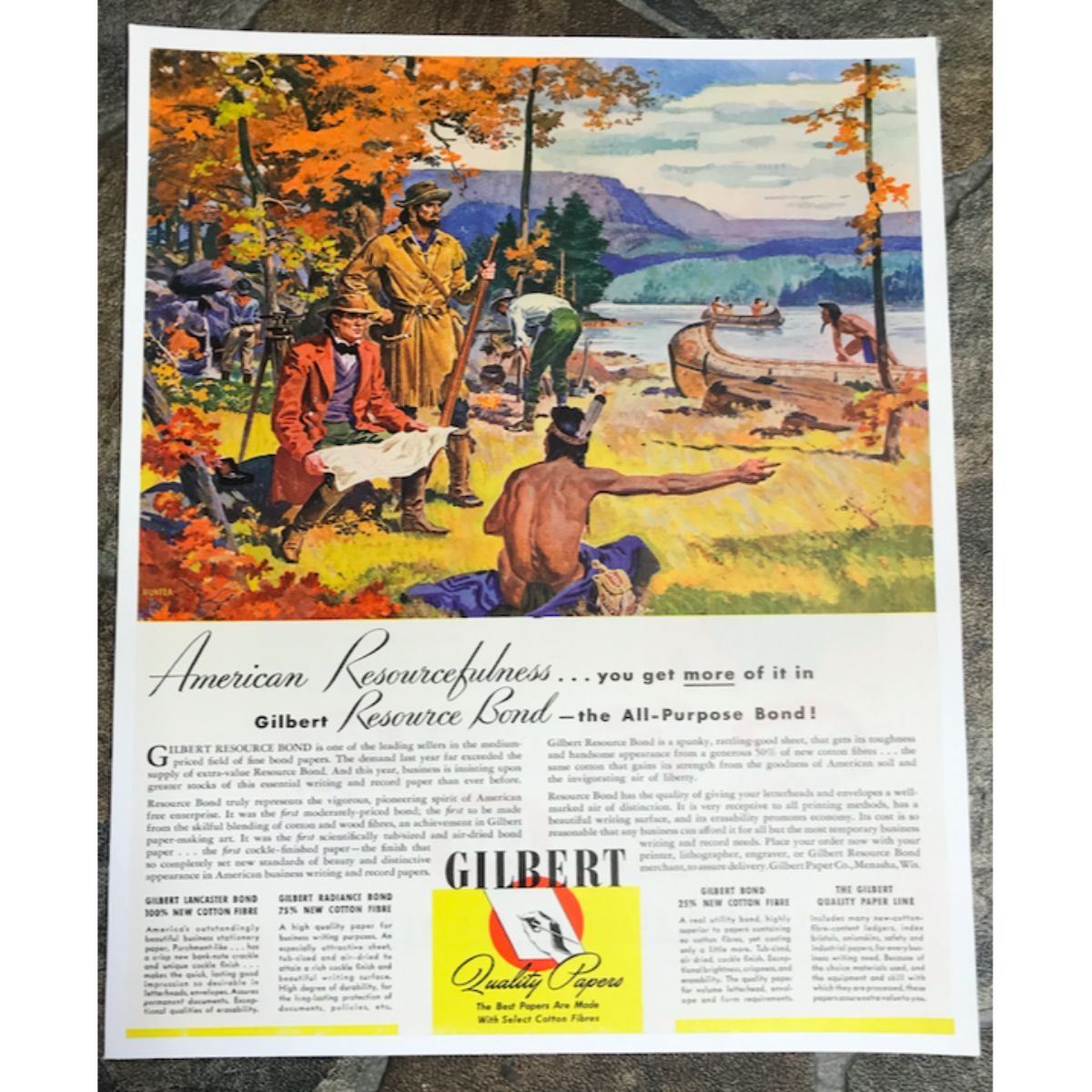 Original advertisement, from a 1940's magazine, for Gilbert Quality Papers. the scene depicts American explorers with Native Americans. The slogan reads, " American Resourcefulness... you get more of it in Gilbert Resource Bond.