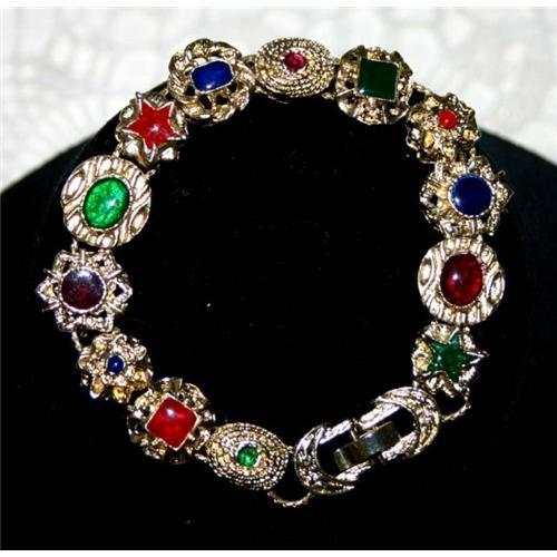This is a gorgeous vintage 1950s Slide Bracelet created in a well detailed heavy gold plated metal adorned with Enameling and Poured Glass Cabochons in primary colors! Weighty and very well made, measuring 7 ½ inches long by approximately ½ of an inch wide. Secures with a fold-over clasp appearing to have never been worn!