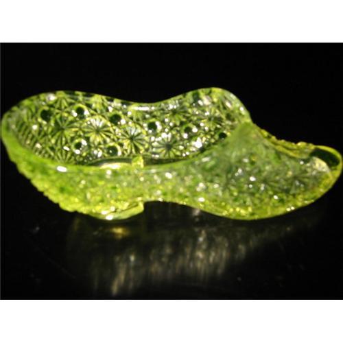 This attractive, 2 inch vintage (frosty snow pattern) cut glass slipper/shoe with pointy toe, is in excellent condition. It has magnificent color of green/yellow and is wonderful. It would make a perfect vanity ring dish. It is 5 inch wide,and something to think about.
