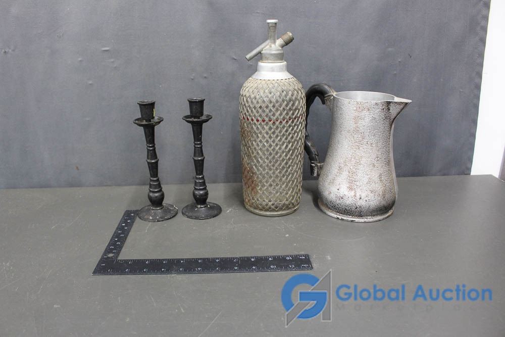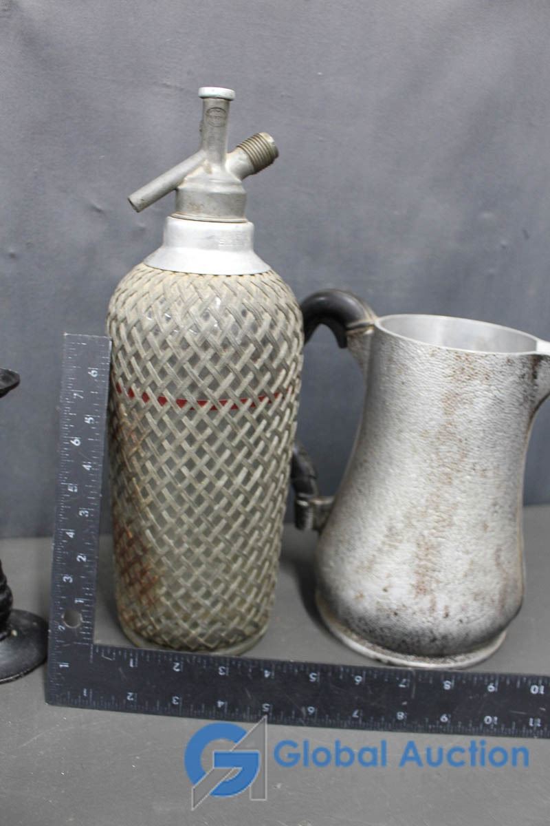 Vintage Glass Syphon, Guardian Service Metal Pitcher and (2) Cast Iron Candle Stick Holders