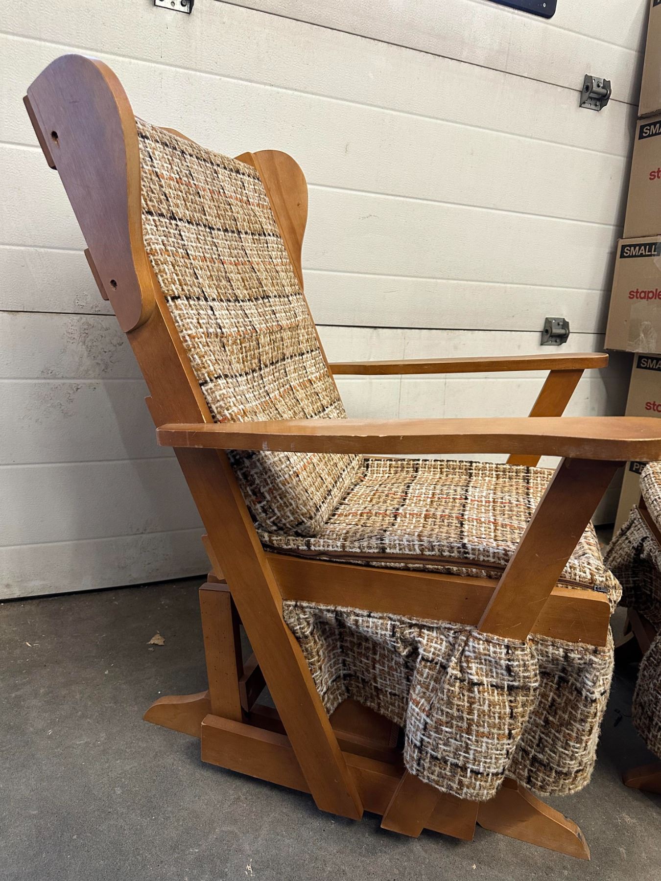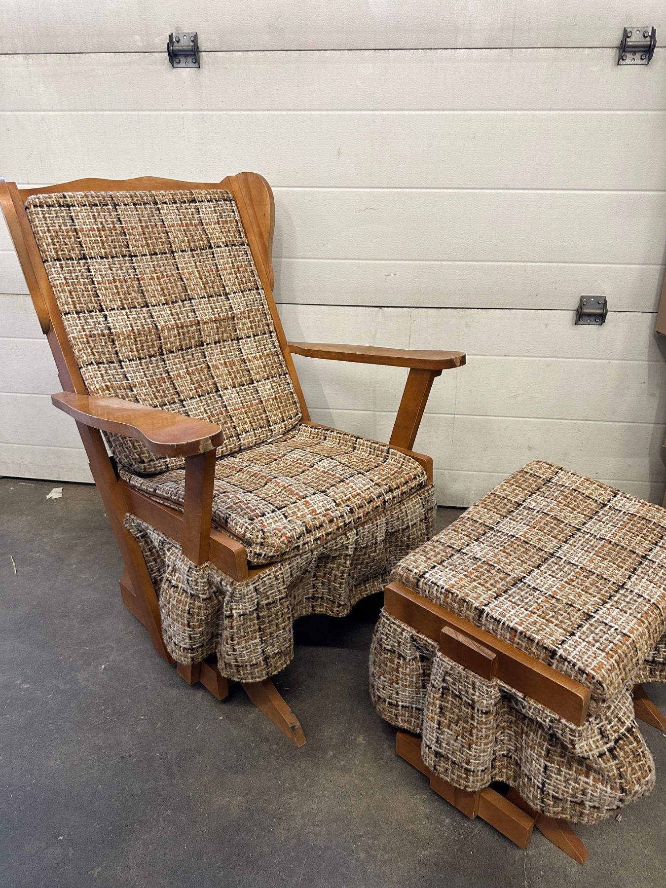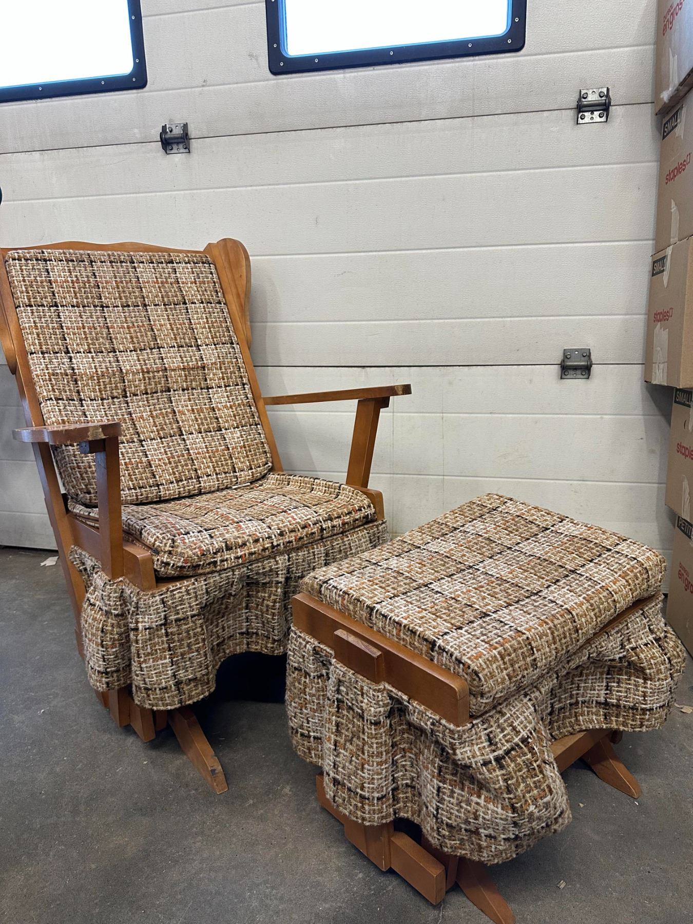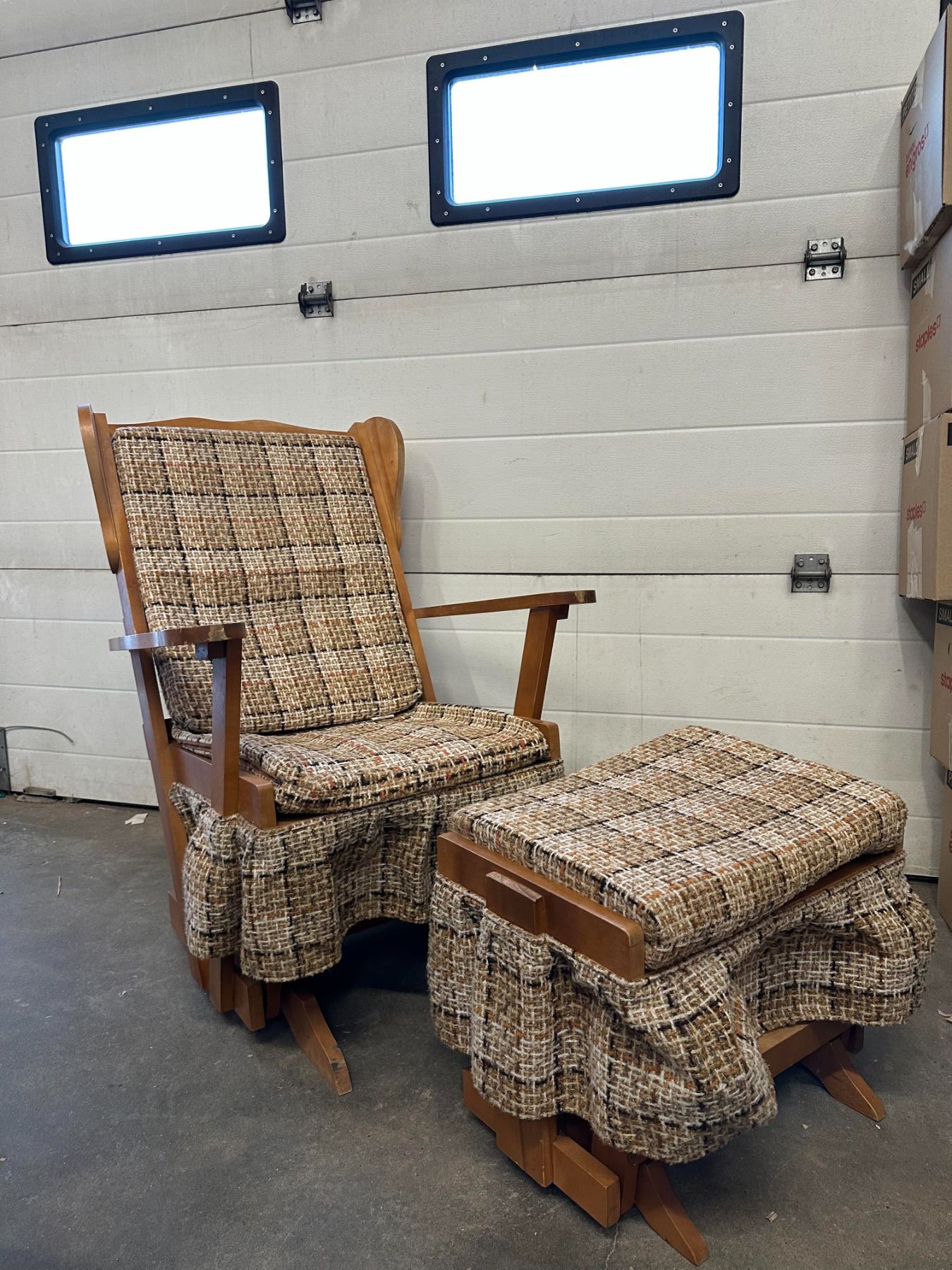 Mid-century glider rocker with matching ottoman; plaid upholstery; wear consistent with age.