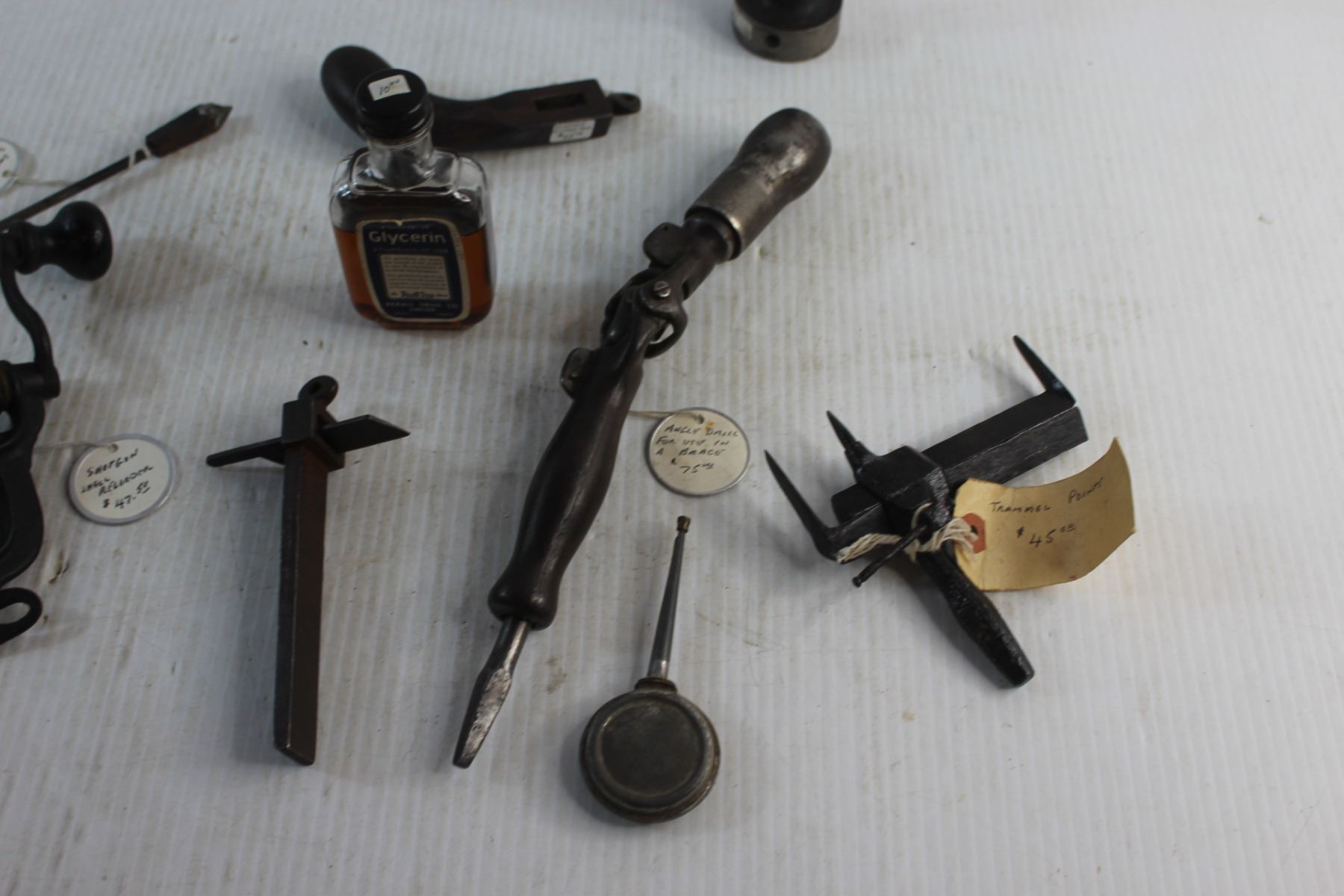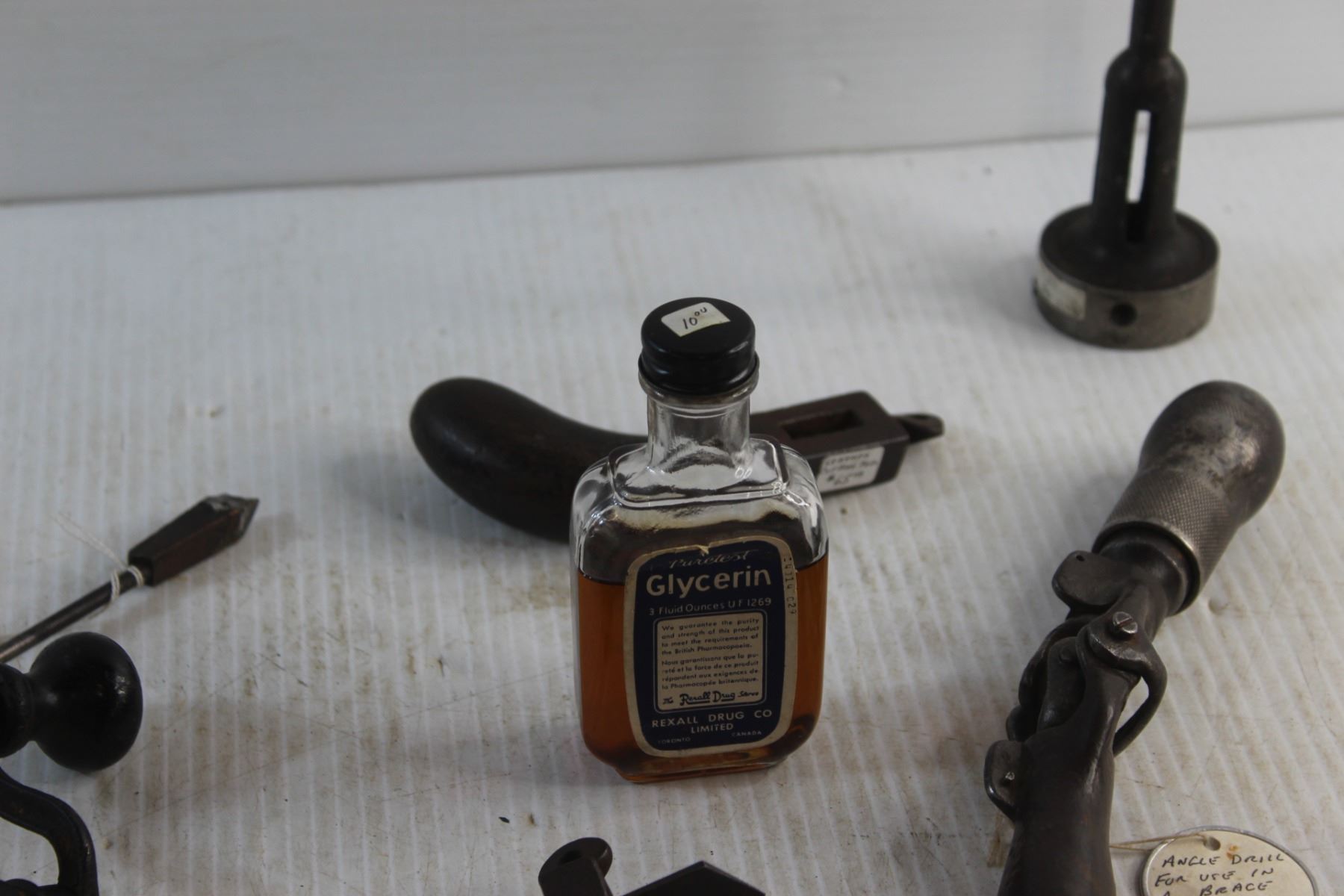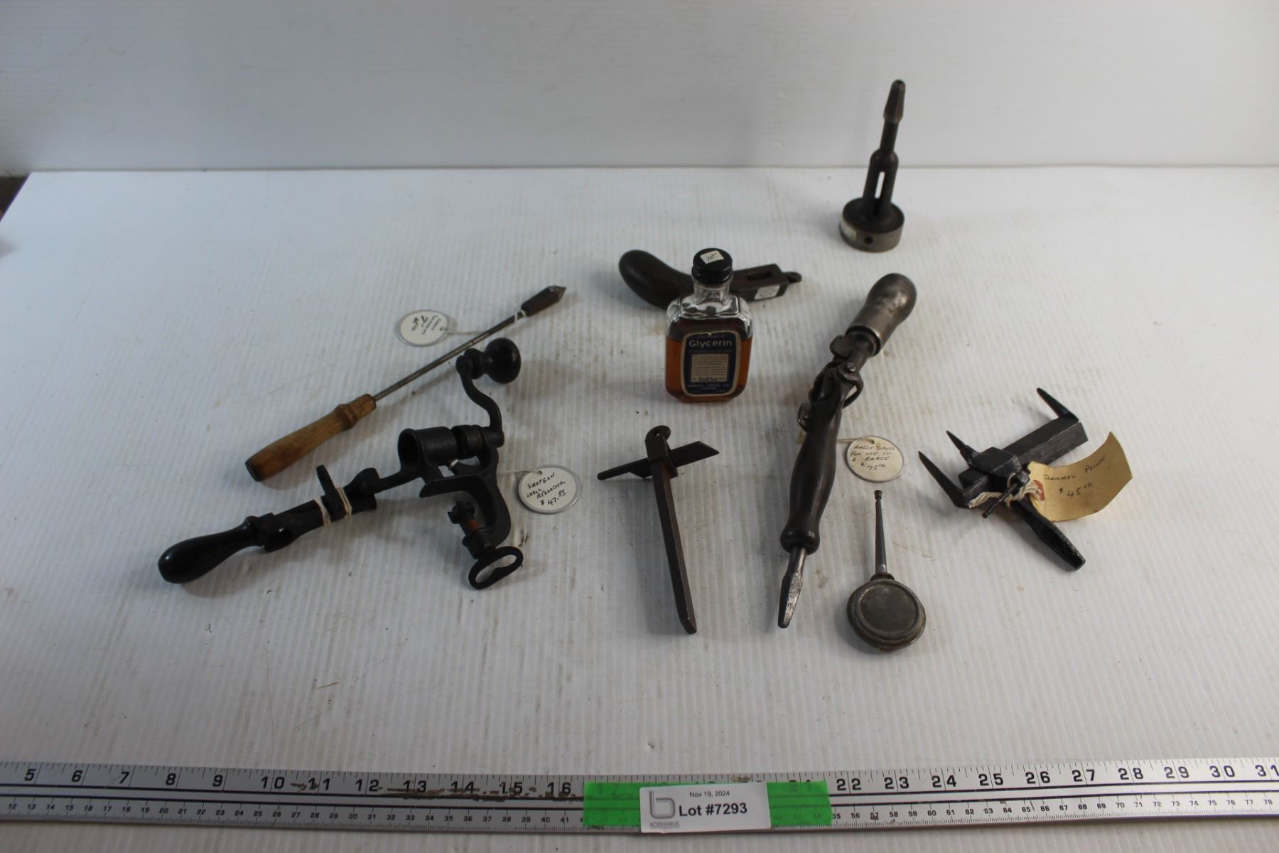 Vintage Glycerin Bottle, Soldering Iron, Angle Drill, Shotgun Shell Reloader, Leather Cutting Tool a