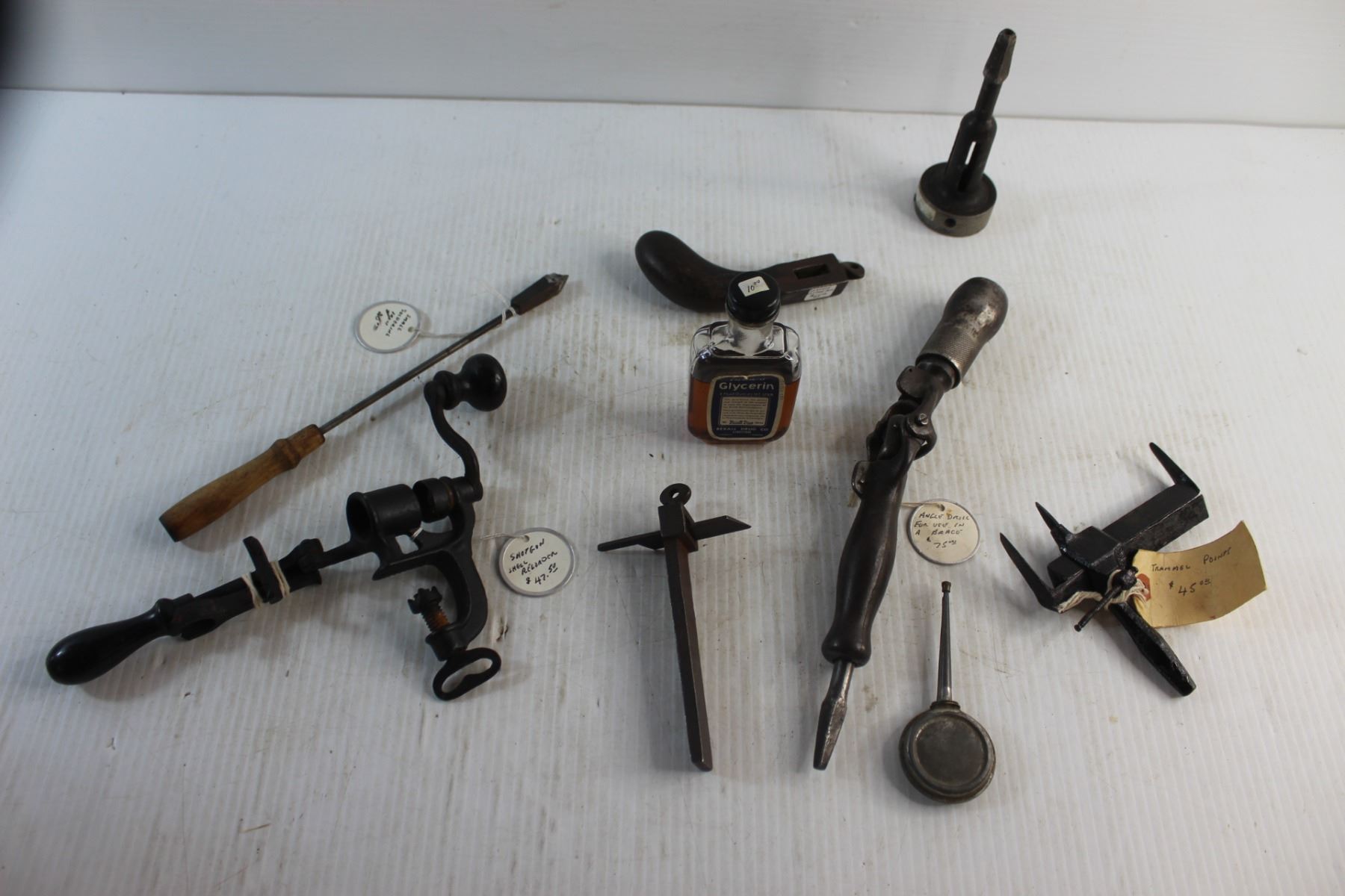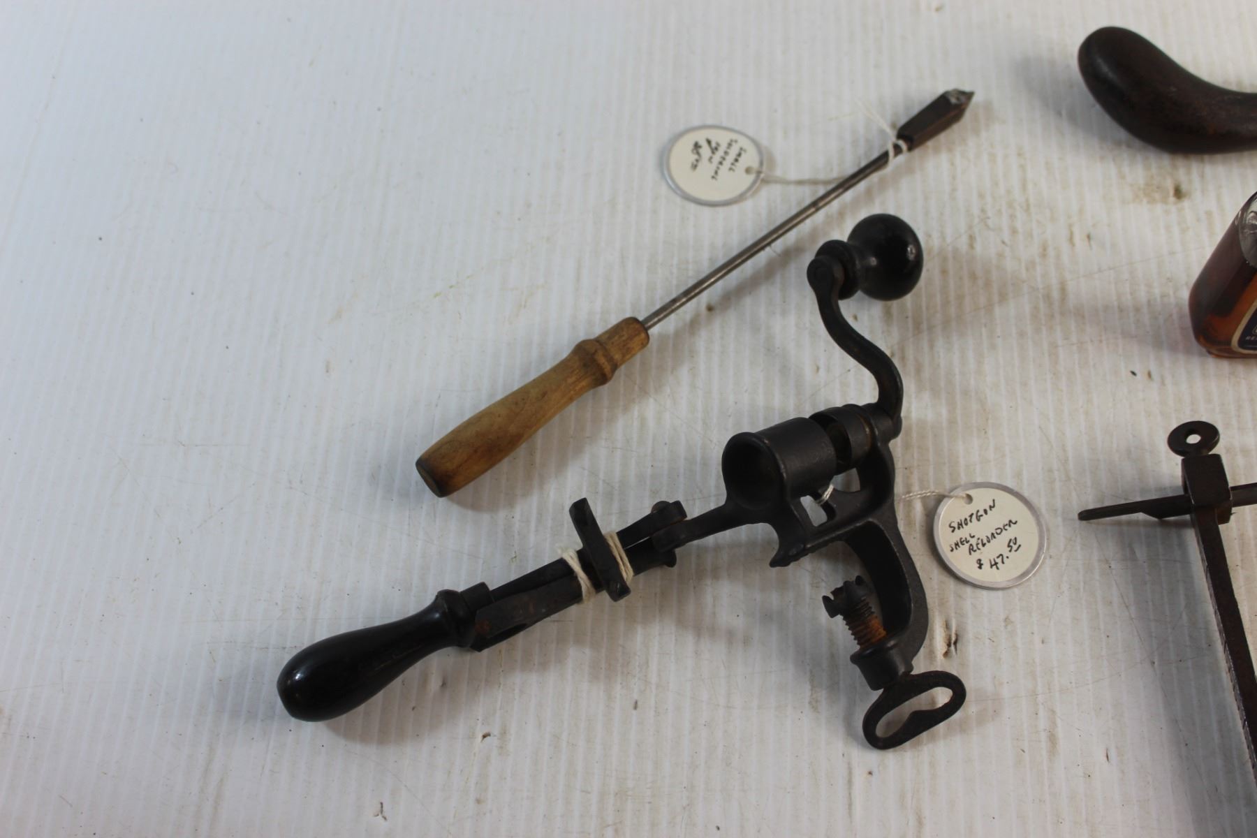 Vintage Glycerin Bottle, Soldering Iron, Angle Drill, Shotgun Shell Reloader, Leather Cutting Tool and Misc.