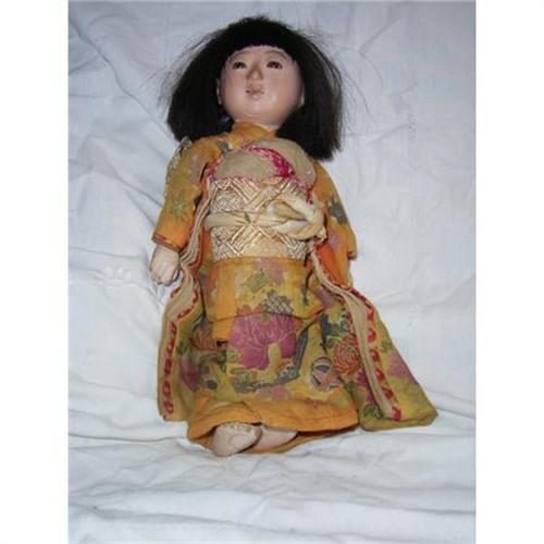 Japanese Ichimatsu ningyo or friendship doll, Taisho period (1912-1926). Original silk costume with floral motif. Gofun face,with inset beautifull glass eyes.Little bit of skin off under right in her neck. Two fingers of her left hand are a little damaged[they are not broken, but you can see the papier maché under it]Her right hand has the same problem [the thumb and the indexfinger but not broken].And her feet have the same problem.at the heels,and at her toes,[but nothing broken]For the rest she is in good condition.