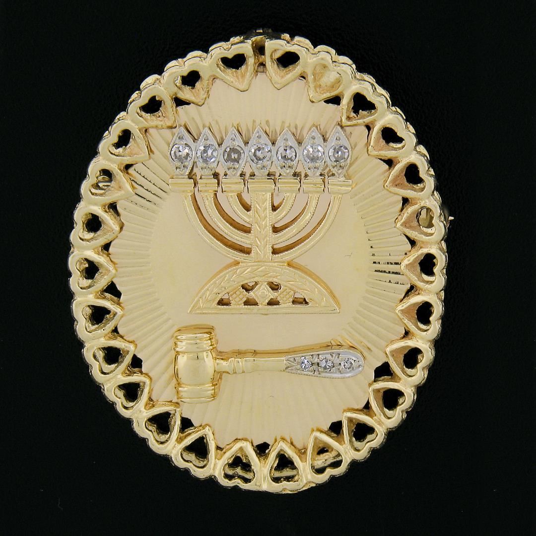 A solid 14k yellow gold brooch pendant, with 10 old single cut natural diamonds (H/I - SI1-I1 ; 0.15ctw). Measures 39.1x31.9mm and weighs a total of 12.35 grams.
