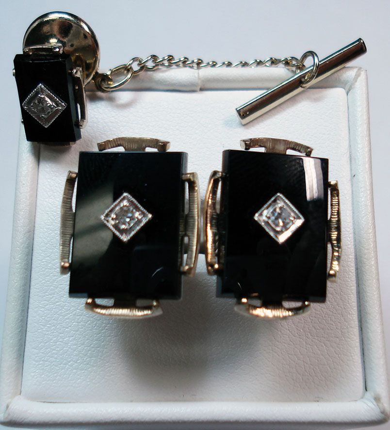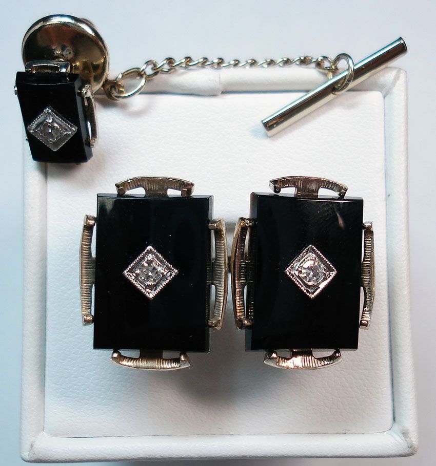Vintage Anson 14k Gold Cufflinks and Tie Clasp. Each cufflink and tie clasp contains a black onyx set with a small round diamond. Wght is 7.05 dwt total.