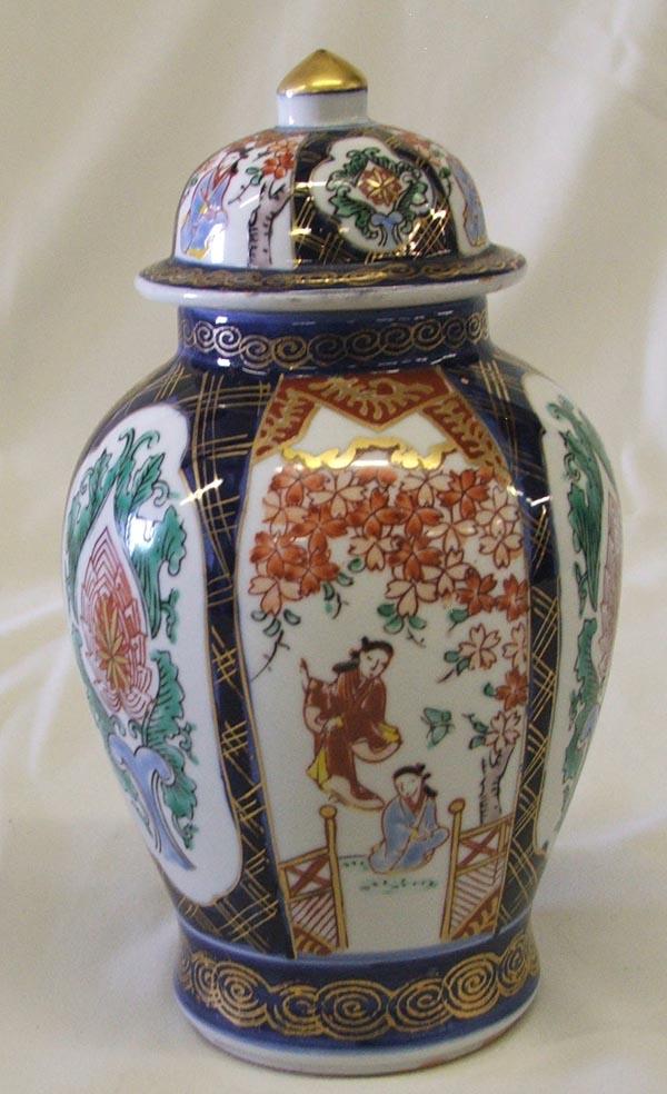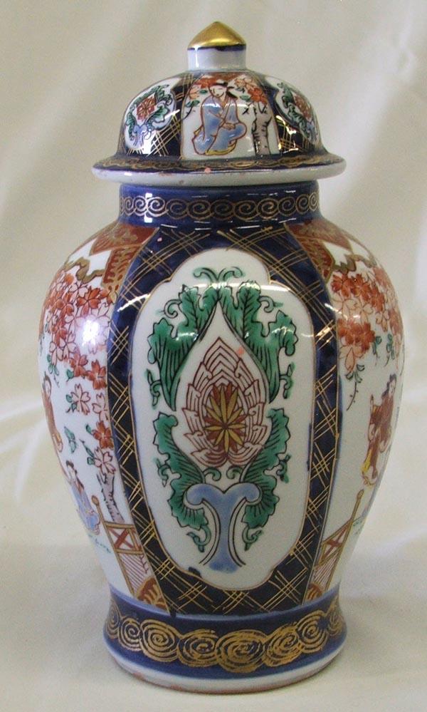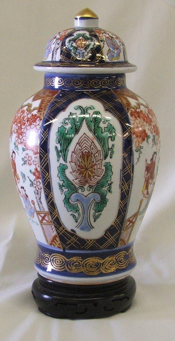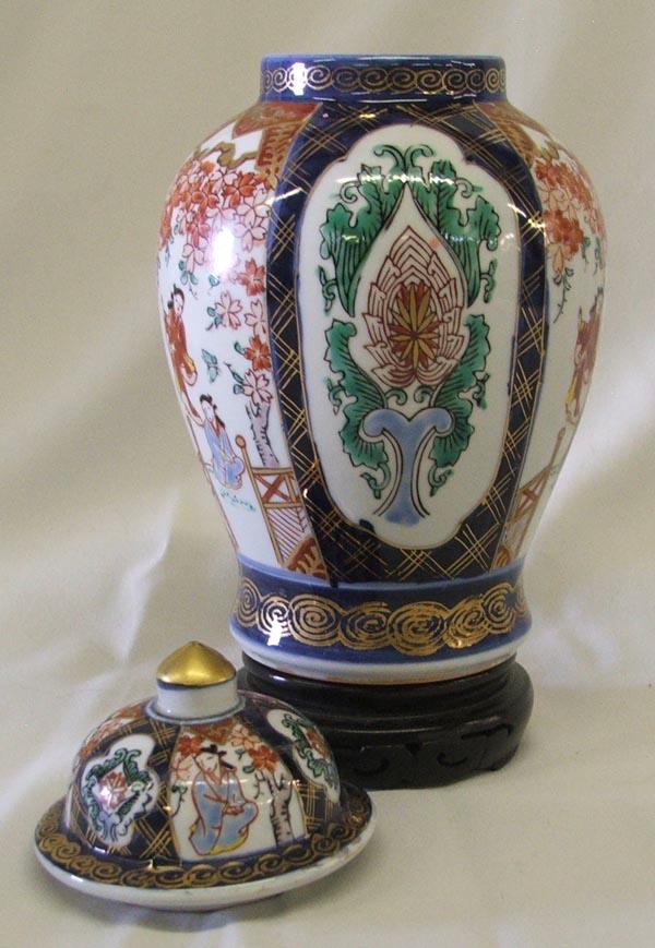 Vintage Gold Imari Ginger Jar with carved wooden stand, measures approx. 9'' x 4'' including stand. SHI $25.