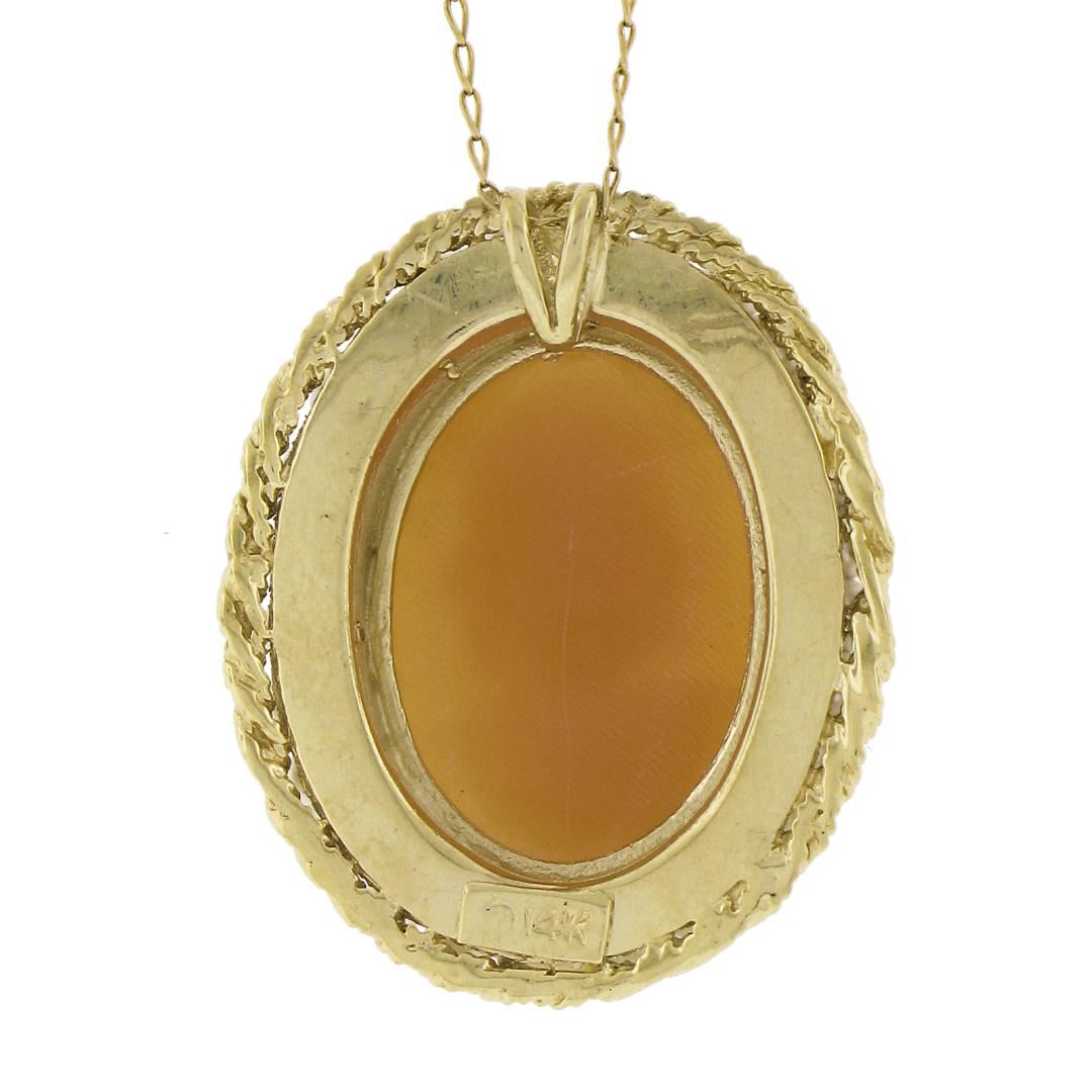 A vintage 14k yellow gold pendant necklace, with 1 oval carved cameo shell (18.2x13.5mm ), surrounded with a halo od round shape cultured pearls (2.3mm ). 17 inch cable link chain, 6.37 grams total weight, pendant measures 26.3x21.7mm.