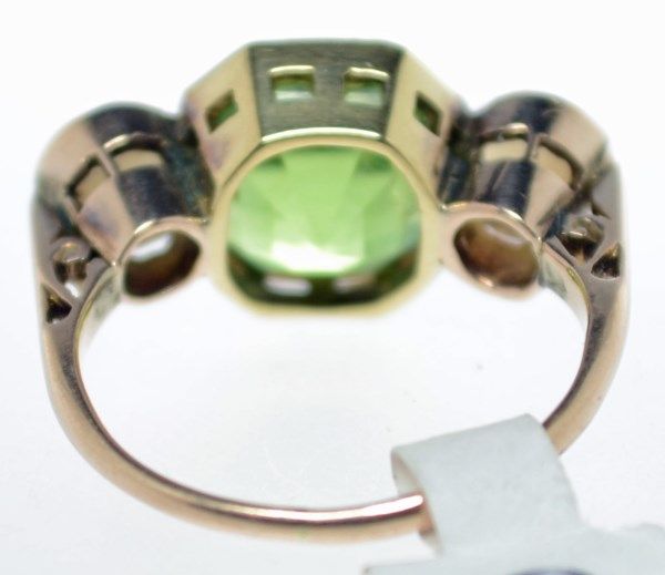 Hard to measure finger size on this ring, because the shank of the ring is shaped as an oval. This ring is vintage and the peridot shows some abrasion at the facet junctures. Acid tests 14K Est value: $350.00-$400.00