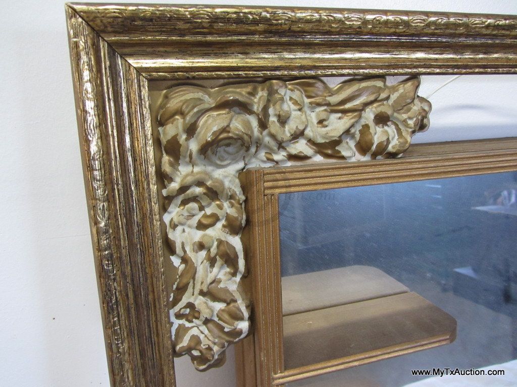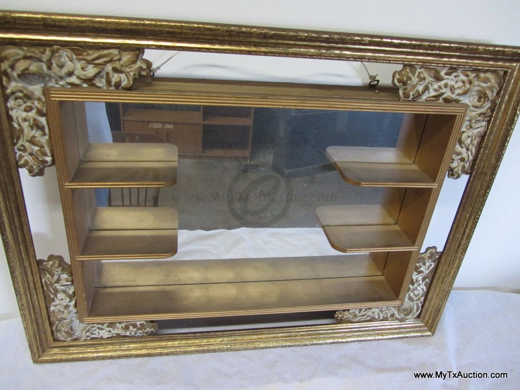 Vintage gold wood framed mirror with 4 shadow box display shelves. The mirror measures 32" x 24" the