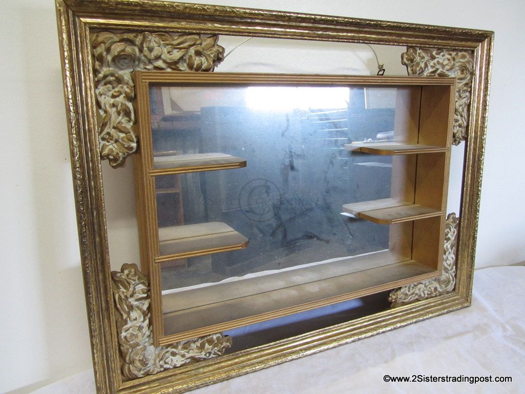 Vintage gold wood framed mirror with 4 shadow box display shelves. The mirror measures 32" x 24" the floral corners are made out of a molded plastic and baked with hardboard for stability. Great vintage piece for your knick-knack display or antique shop.