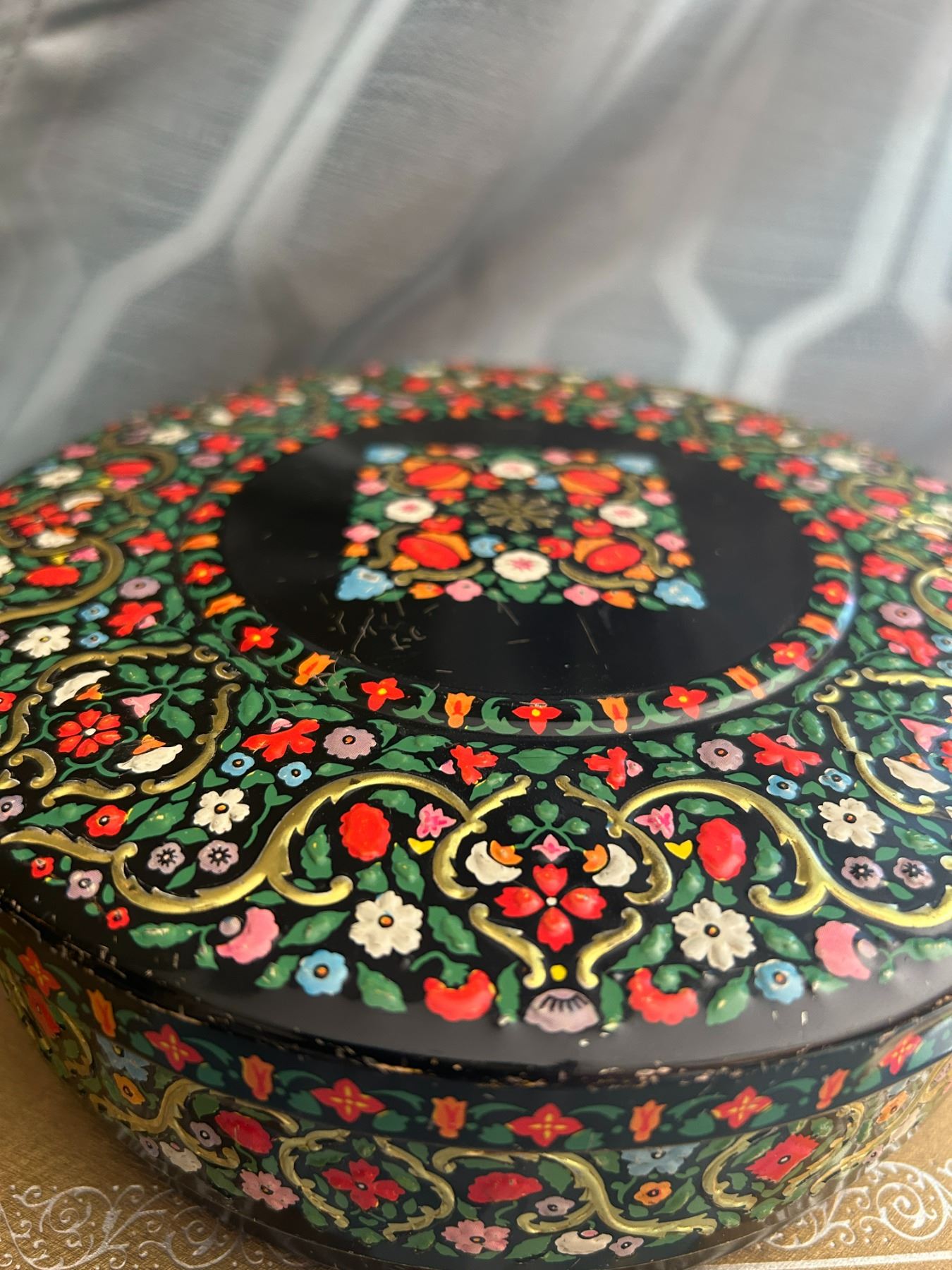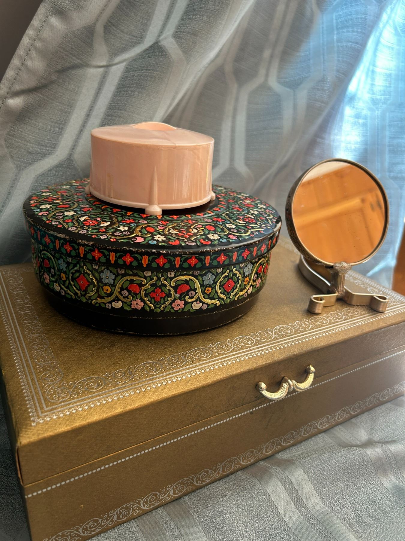 Vintage Good Jewelry Box Colorfuk Round cookie Tin , Powder Puff