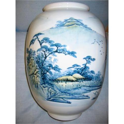 This gorgeous 16 inch Oriental pot is of fine porcelain and is signed by Artist on the base. It has decoration and hand painted with mountain and flowers and outdoor motif. Amazing and beautiful! Design Element for out or indoor. It is 10 inch wide and 6 inch in diameter. The Glaze and touch of yellow shade is remarkable.
