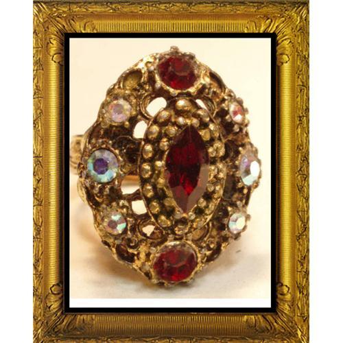 The combination of RED and Firey Aurora borealis really brings out the charm of this vintage fancy metal work ring! Gothic or medieval or however you want to describe this almost queenly ring, it is really pretty with this etched band that holds it all together. The setting is chunky and measures 1 1/4" long. The gilt ring will go up to a size 9. Gentle wear to the gold.