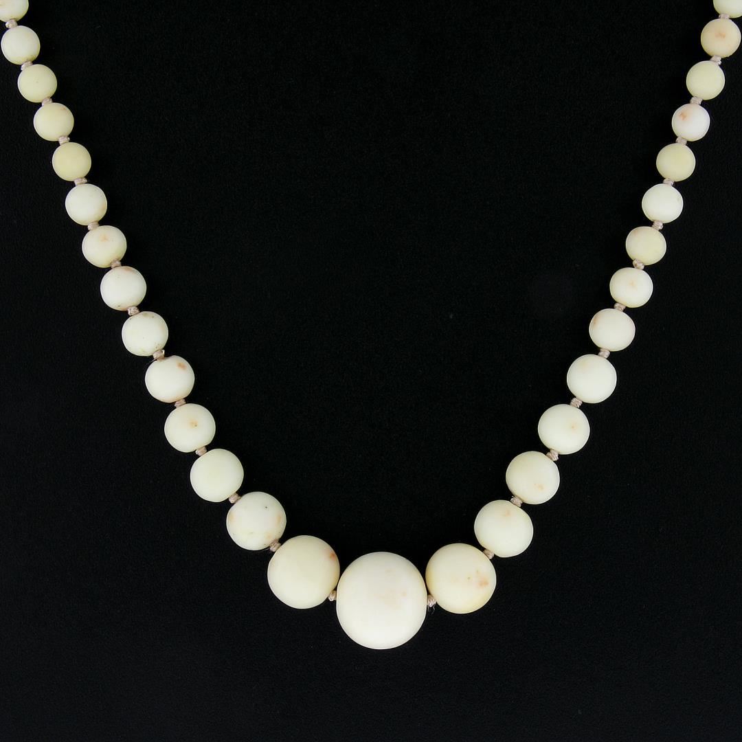 A vintage coral strand necklace with 14k white golf clasp, featuring 97 round bead shape natural corals. It weighs a total of 44.46 grams, graduated from 4.75-16mm wide, and measures 26.5 inches in length.