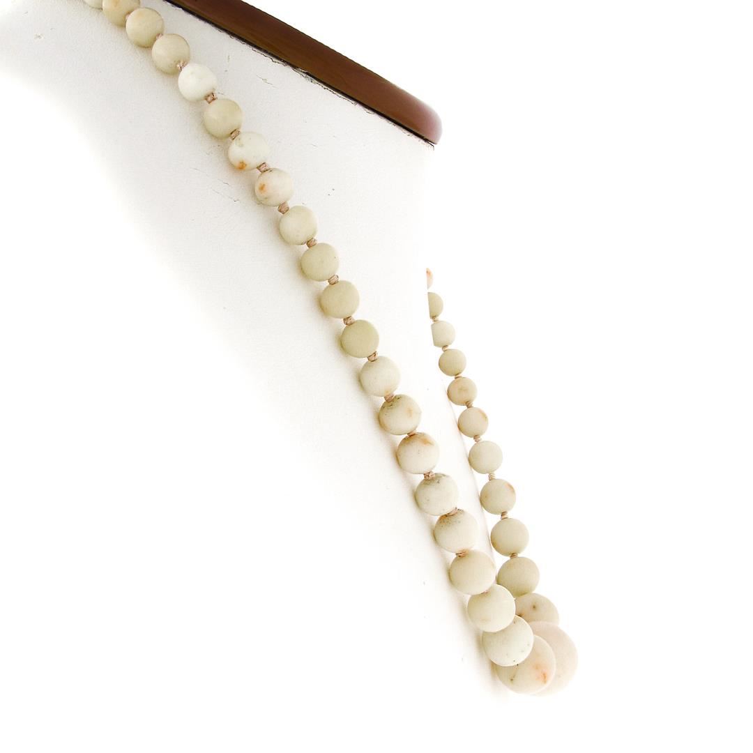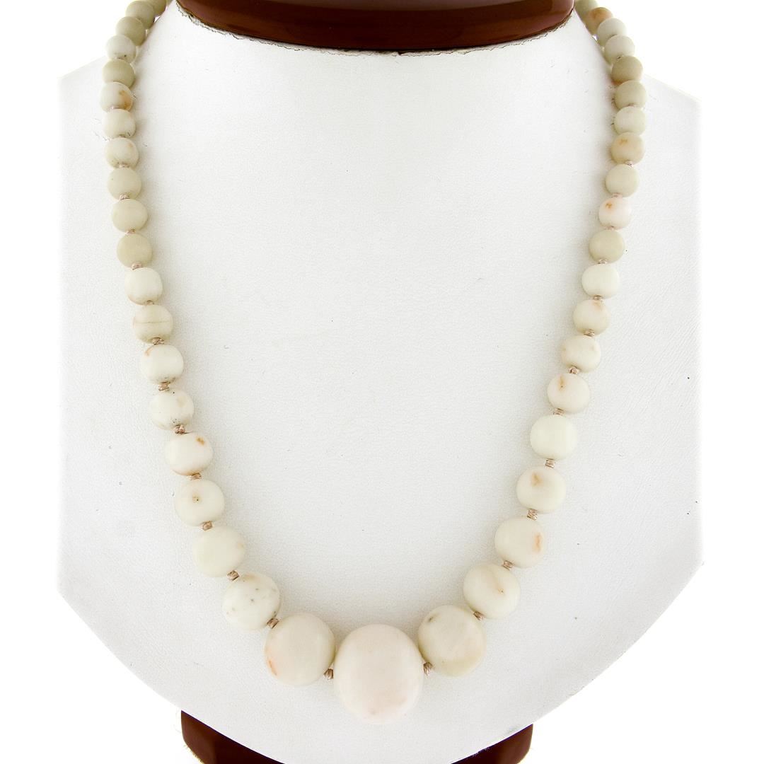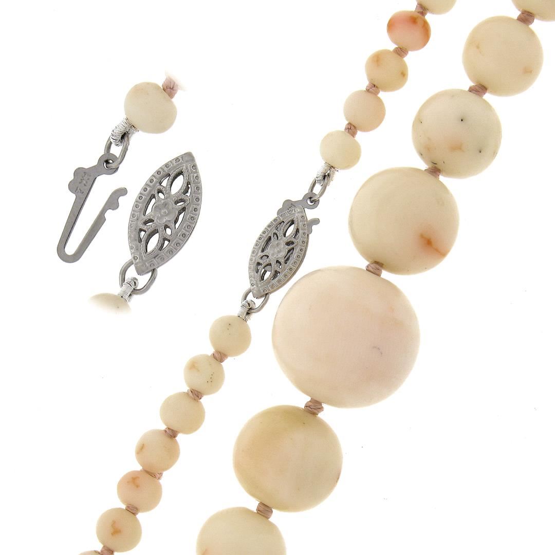 A vintage coral strand necklace with 14k white golf clasp, featuring 97 round bead shape natural corals. It weighs a total of 44.46 grams, graduated from 4.75-16mm wide, and measures 26.5 inches in length.
