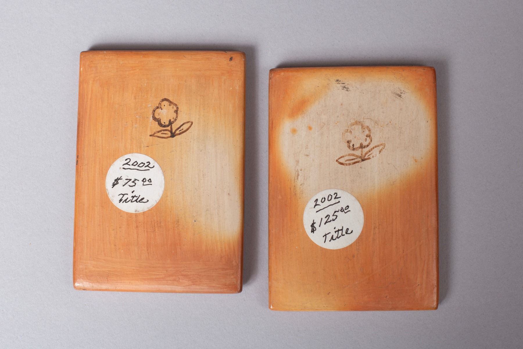 A group of two pottery tiles created by renowned Hopi-Tewa potter Sadie Adams, known for her intricate and symbolic designs. Each tile is signed on the verso with the artist's distinctive flower hallmark, a tribute to her Hopi name, "Flower Girl".