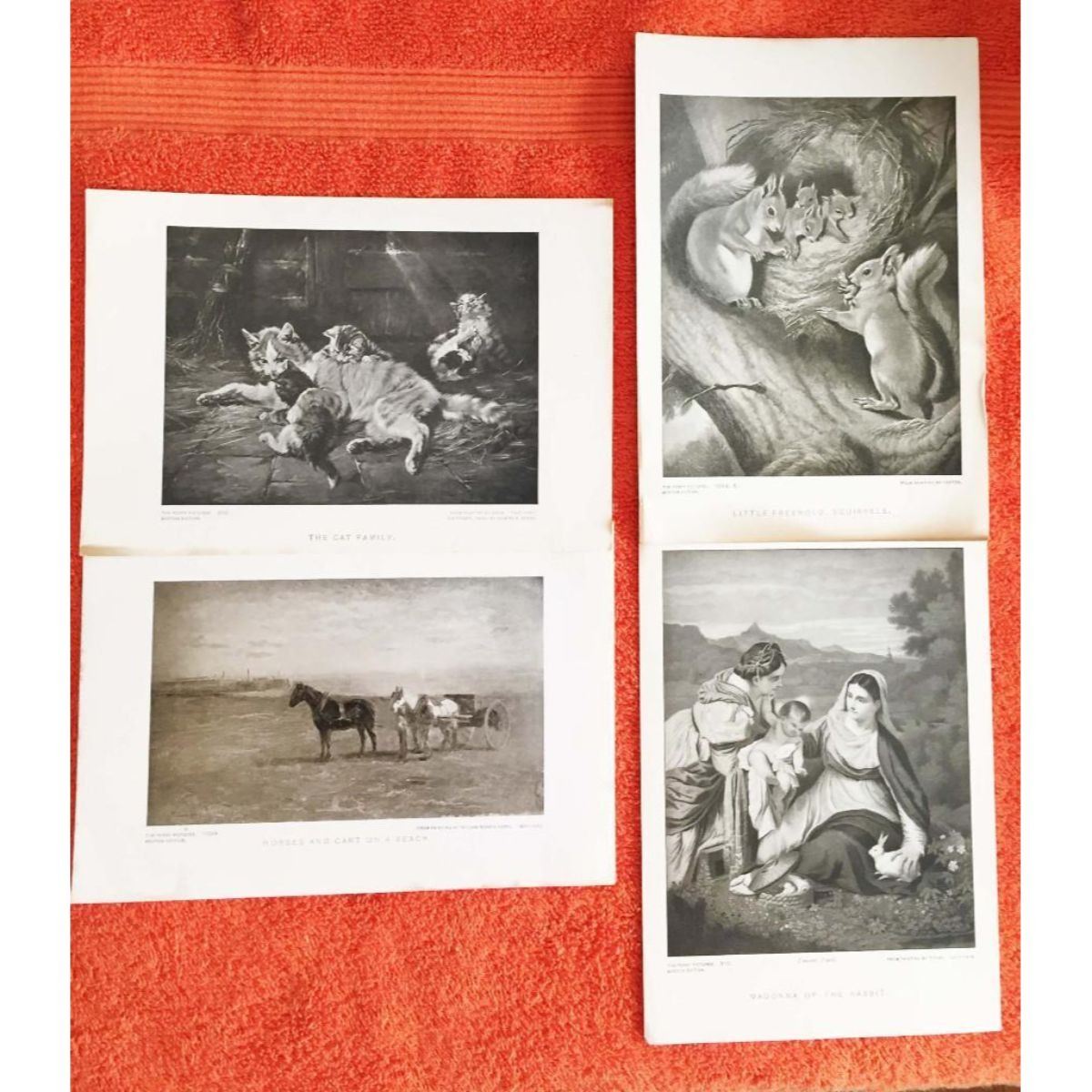 Vintage c1920’s half-tone prints by Perry Pictures, Animals, group of 4: Horses & Cart on a Beach, The Cat Family, Little Freehold-Squirrels, Madonna of the Rabbit. Each 5 1/2" X 8" print size, suitable for framing. *** Information about Perry Pictures - Eugene Ashton Perry, Master of the Center Grammar School of Malden, Massachusetts, discovered the possibility of making and distributing half-tone reproductions of famous paintings, sculptures & architecture to be sold at reasonable prices so that everyone could afford to own art. Â
