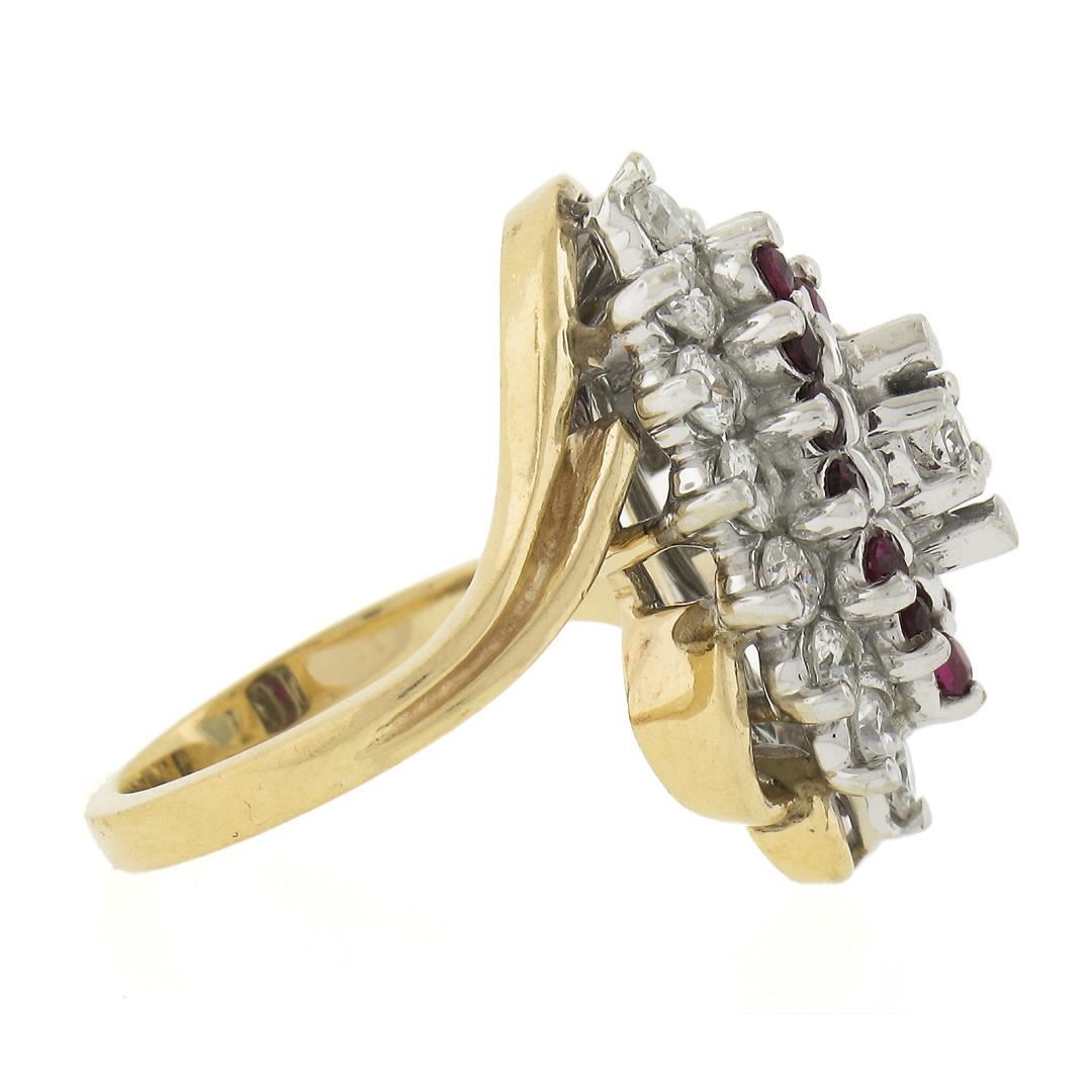 A vintage solid 14k yellow & white gold ring by H. Stern, featuring 12 round cut natrual rubies (0.60ctw), and 15 round cut natural diamonds (E/F - VS2 -SI2 ; 1.0ctw). The ring is size 6.5, weighs a total of 8.27 grams, and measures 21.7mm wide.