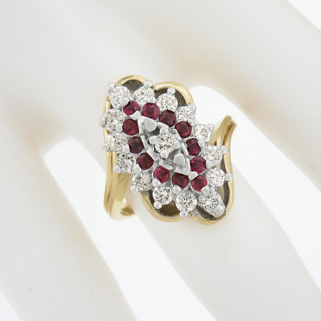 A vintage solid 14k yellow & white gold ring by H. Stern, featuring 12 round cut natrual rubies (0.60ctw), and 15 round cut natural diamonds (E/F - VS2 -SI2 ; 1.0ctw). The ring is size 6.5, weighs a total of 8.27 grams, and measures 21.7mm wide.