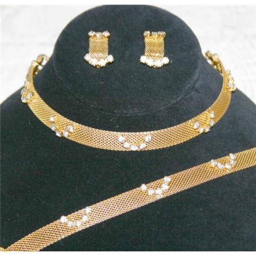 This is a wonderful unsigned vintage 1950s Parure consisting of a Necklace, Bracelet and Earrings. Each piece is crafted in a gold plated flexible mesh metal and set with sparkling Chaton Rhinestones creating a half moon effect. Each Rhinestone is multi-faceted and prong set for a fabulous sparkle! The Necklace measures 17 inches long including the 8 inch long extender, securing with a C hook closure, allowing you to wear this as a Choker or a Necklace. The Bracelet measures 7 inches long, securing with a fold-over clasp and safety chain. The matching Earrings are also created in a flexible mesh measuring 1 inch long and securing with a clip-back closure. All pieces in this fabulous Parure are ¾ of an inch wide. Appearing to have never been worn!