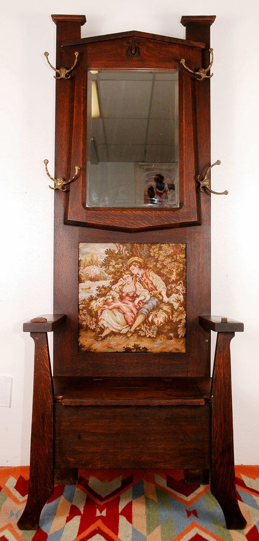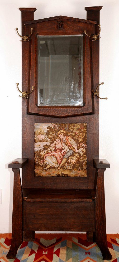 Vintage Hall Tree, needle point back accent, beveled mirror and 4 brass hooks. Fair condition for its age, cushion depicts sitting couple, extra storage under seat. H 78" x W 28" x D 18.