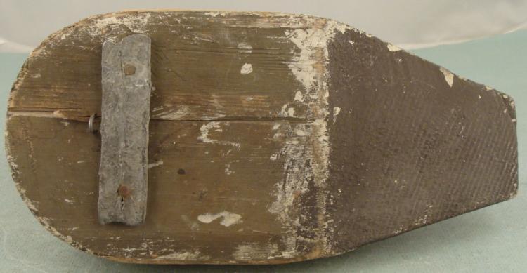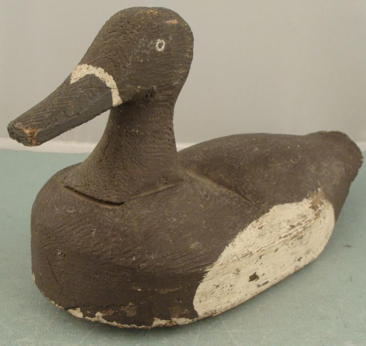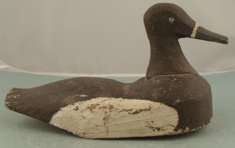 This is a hand carved duck decoy made of a wood, and painted brown and white. It is a rustic figure, and the surface and paint are weather worn. The dimensions are 12 x 7 1/2 x 5 1/2 inches. The base has nails and a metal strip where it was probably mounted to something at one time. This decay dates back many years.