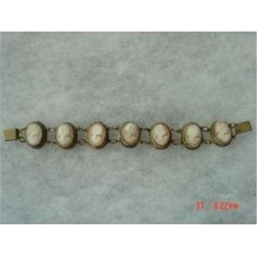 I'm no expert on cameos! Here is a Antique Vintage Cameo bracelet. These are hand carved cameos on each of the 7 individual links. Probably late 1800s! There is different shades and levels of the 3 metals from the bottom to the center filigree type one to the top metal. Not sure what the metal is, Very good condition