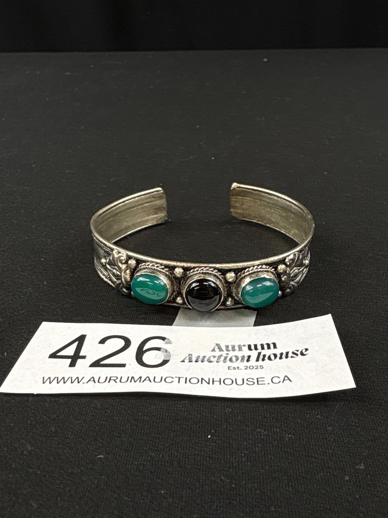 Vintage Hand Crafted Low Silver w/ Green + Black Onyx Stones Open Cuff Bangle